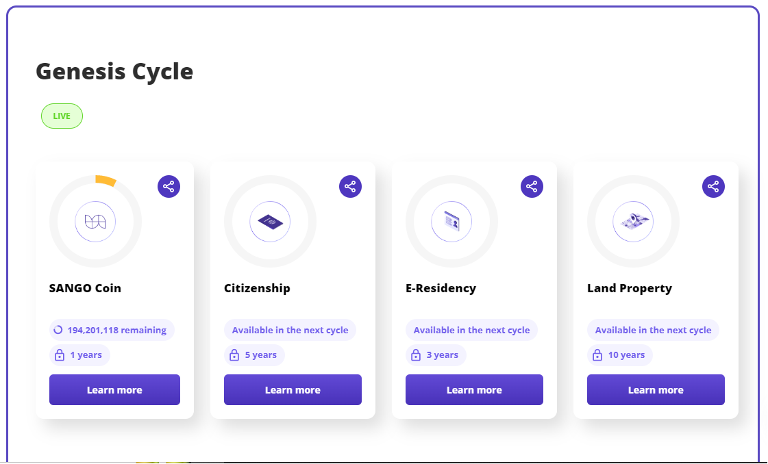 Dalam dokumen resmi Sango disebutkan bahwa investor bisa membeli kewarganegaraan dengan mata uang Sango seharga US$60 ribu. Dana tersebut memiliki lock period selama 5 tahun. Sedangkan, untuk e-residency, harga yang dipatok berada di level US$6.000 dengan lock period selama 3 tahun.
