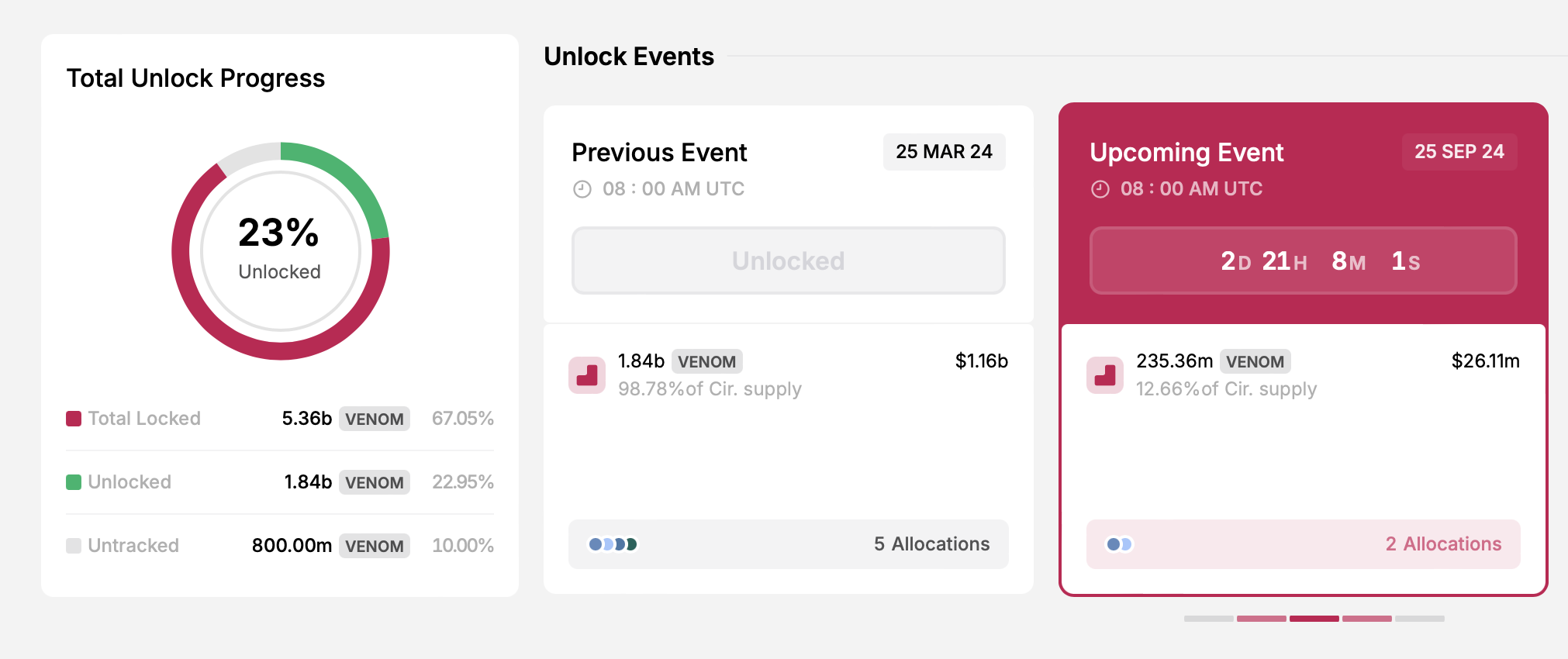 Baru-baru ini, Venom mulai membuka kuncian tokennya, dengan kecepatan pelepasan yang diharapkan akan meningkat seiring waktu. Fase ini akan melepaskan 219,52 juta token untuk mendukung ekosistem, dengan nilai sekitar US$23,45 juta. Selain itu, komunitas akan menerima 15,84 juta token, senilai sekitar US$1,76 juta.