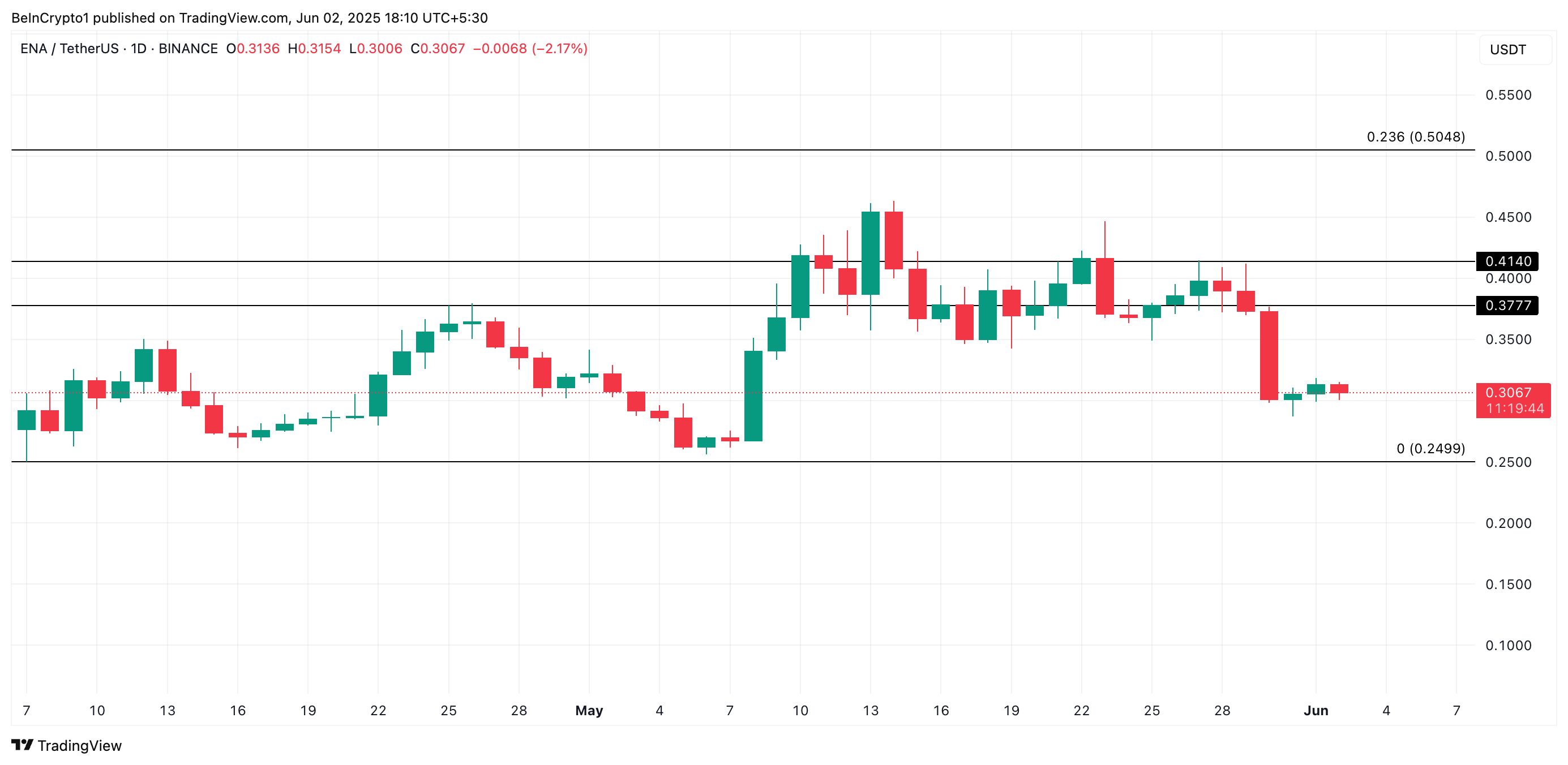 Saat ini, ENA diperdagangkan pada US$0,30, berada di atas lantai support yang terbentuk di US$0,24. Jika tekanan bullish menguat, token ini bisa naik menuju US$0,37.