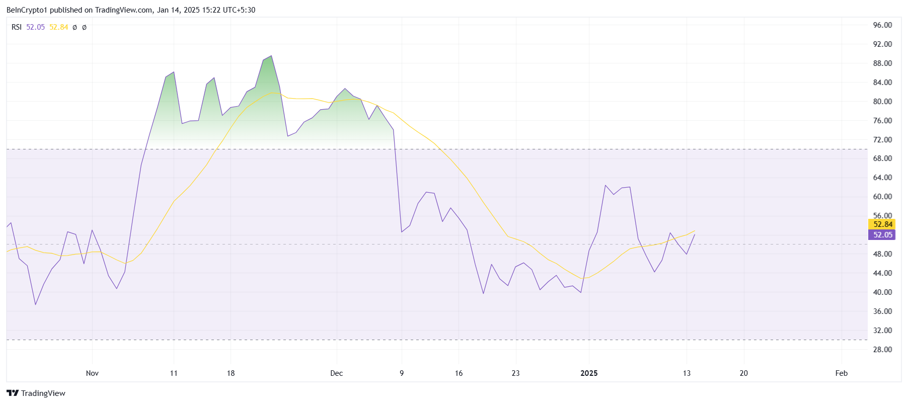Relative Strength Index (RSI) untuk Cardano menunjukkan perbaikan bertahap, mencerminkan minat beli yang meningkat. Namun, RSI belum berhasil mengubah level netral 50,0 menjadi support, indikator kunci momentum bullish yang kuat. Sampai ini terjadi, ADA mungkin menghadapi tantangan dalam mencapai pertumbuhan berkelanjutan.