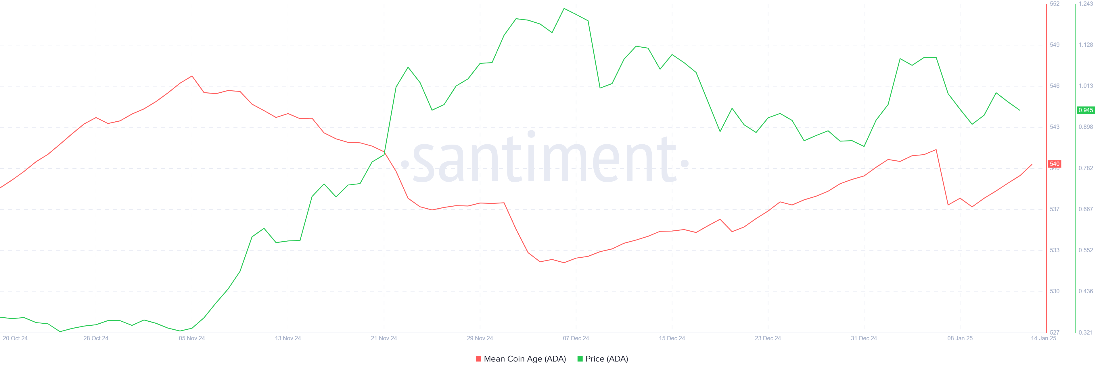 Mean Coin Age (MCA) Cardano kembali meningkat, menandakan optimisme baru di antara para holder. Peningkatan MCA menunjukkan bahwa investor memilih untuk menahan ADA mereka daripada menjual, tren yang memperkuat ketahanan aset dan potensi pertumbuhan jangka panjang.