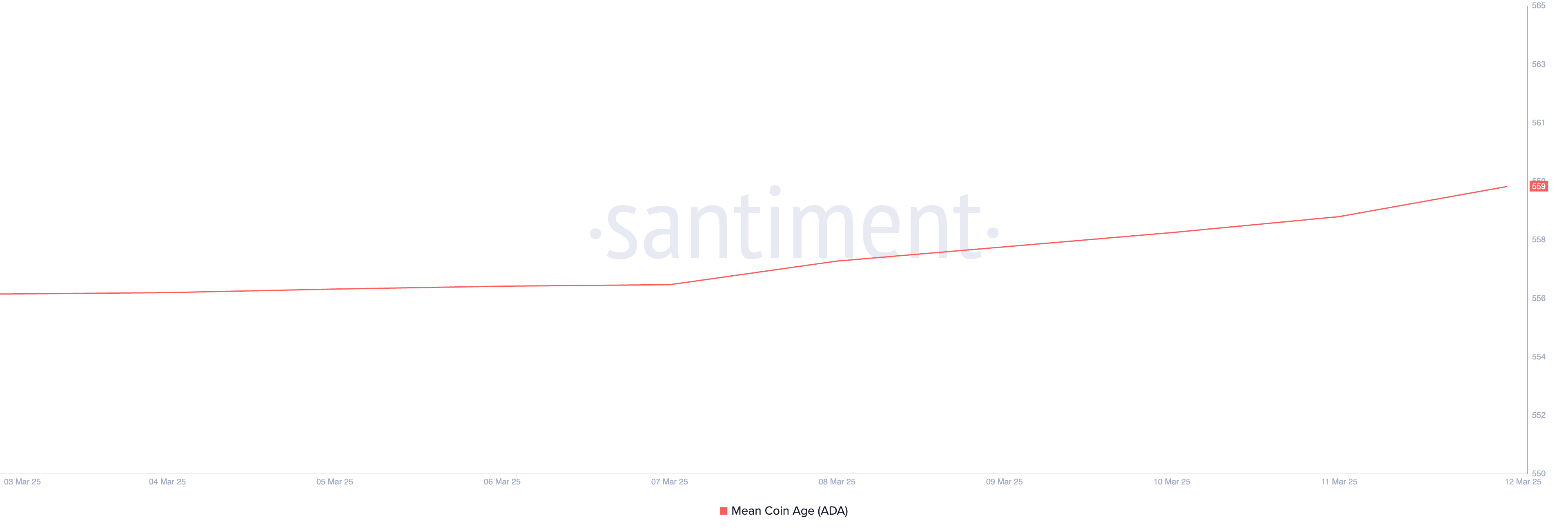 Ada tren HODLing yang stabil di antara holder jangka panjang ADA, yang tercermin dari meningkatnya Mean Coin Age. Menurut Santiment, nilai metrik ini naik 1% sejak 3 Maret.