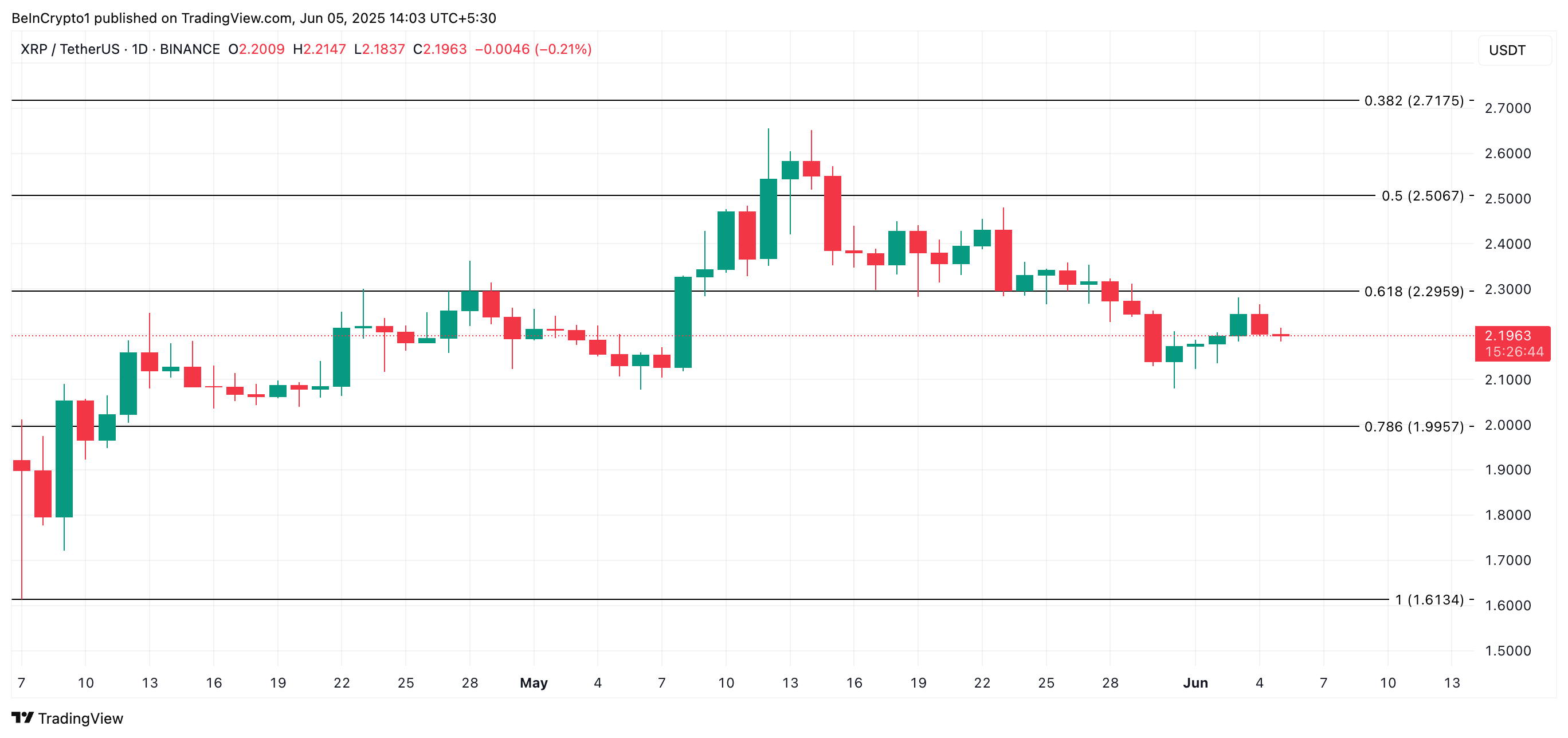 XRP telah mengalami pemulihan sejak awal Juni, berusaha menghapus kerugian yang dialaminya pada bulan Mei. Pada waktu publikasi, token ini diperdagangkan pada US$2,19