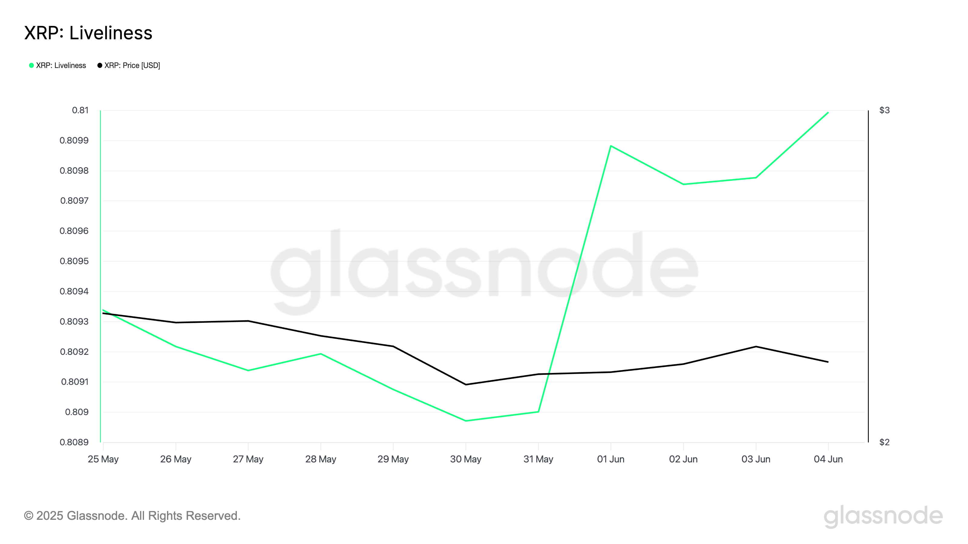 Bersamaan dengan harganya, liveliness XRP telah meningkat sejak Juni dimulai, menunjukkan bahwa LTH melihat pemulihan harga baru-baru ini sebagai kesempatan untuk melepas kepemilikan mereka. Menurut Glassnode, metrik ini ditutup pada 3 Juni di angka 0,809.