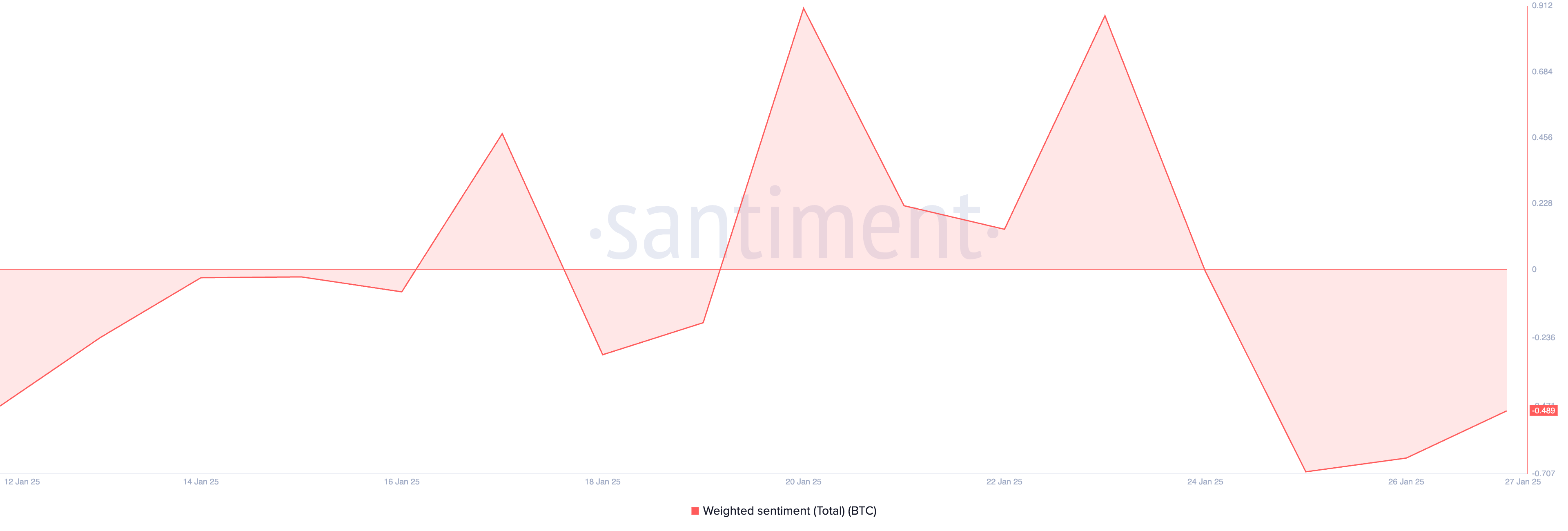 SponsoredMeskipun harga BTC telah pulih dari posisi terendah hari Senin, bias negatif terus mengikuti koin utama ini. Hal ini dibuktikan dengan sentimen tertimbang negatifnya, yang saat ini berada di -0,48.