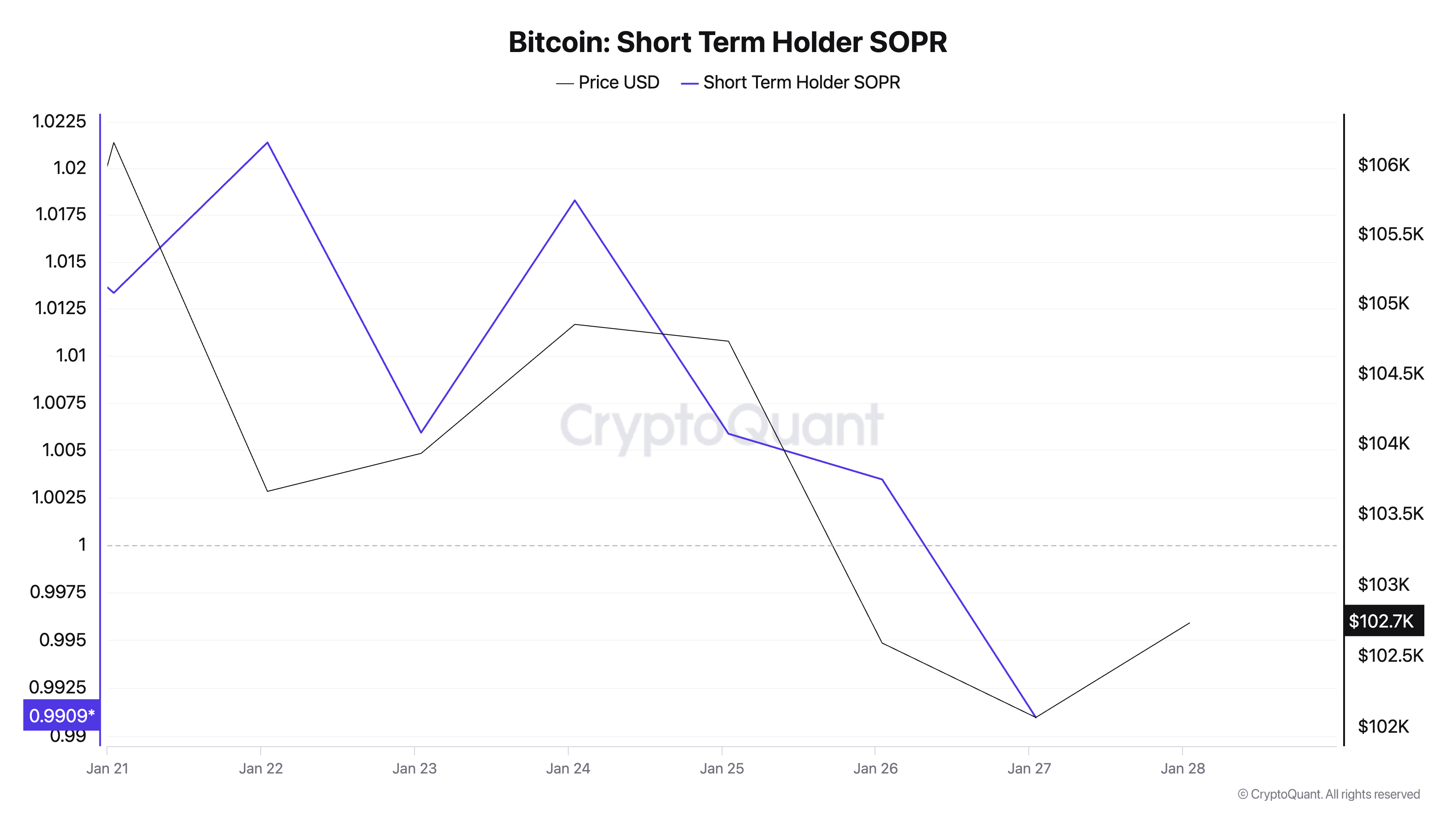 Menurut data dari CryptoQuant, Spent Output Profit Ratio (SOPR) untuk STH Bitcoin menurun selama seminggu terakhir. Ketika harga koin turun di bawah US$100.000 kemarin, nilai metrik ini jatuh di bawah 1. Pada saat penulisan, nilainya adalah 0,99.