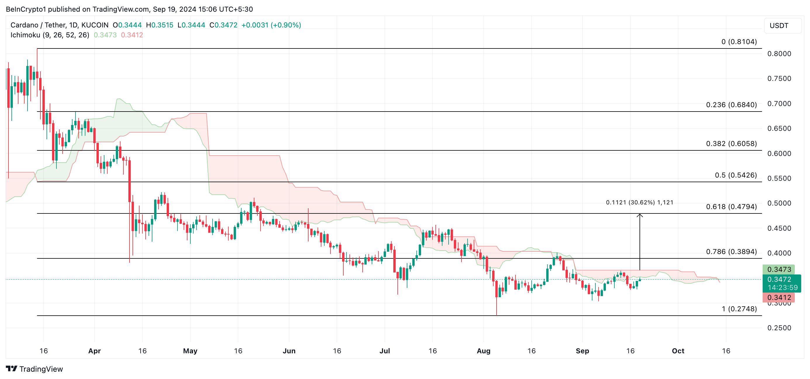 Jika ADA berhasil menembus Leading Span A, ia bisa naik menuju Leading Span B, level resistensi yang lebih kuat. Menembus dengan sukses akan menempatkan Cardano untuk potensi keuntungan 31%, dengan target harga US$0,47.