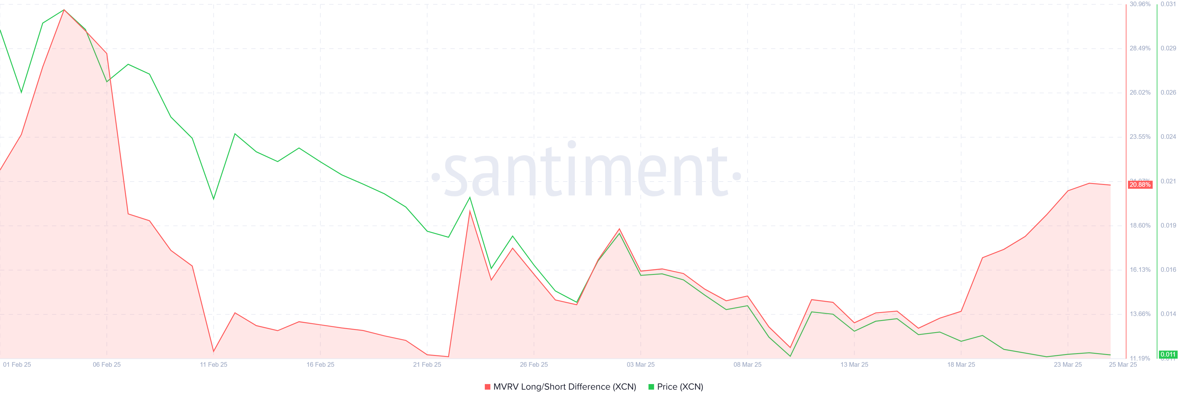 Melihat momentum makro secara keseluruhan, Onyxcoin menunjukkan beberapa tanda positif ketika mempertimbangkan MVRV Long/Short Difference. Holder jangka panjang (LTH) saat ini melihat peningkatan keuntungan, sementara holder jangka pendek (STH) mengalami kerugian akibat penurunan harga baru-baru ini. Dinamika ini memberikan fondasi yang kuat bagi Onyxcoin, karena LTH cenderung tidak menjual selama kondisi bearish, membantu menstabilkan harga.