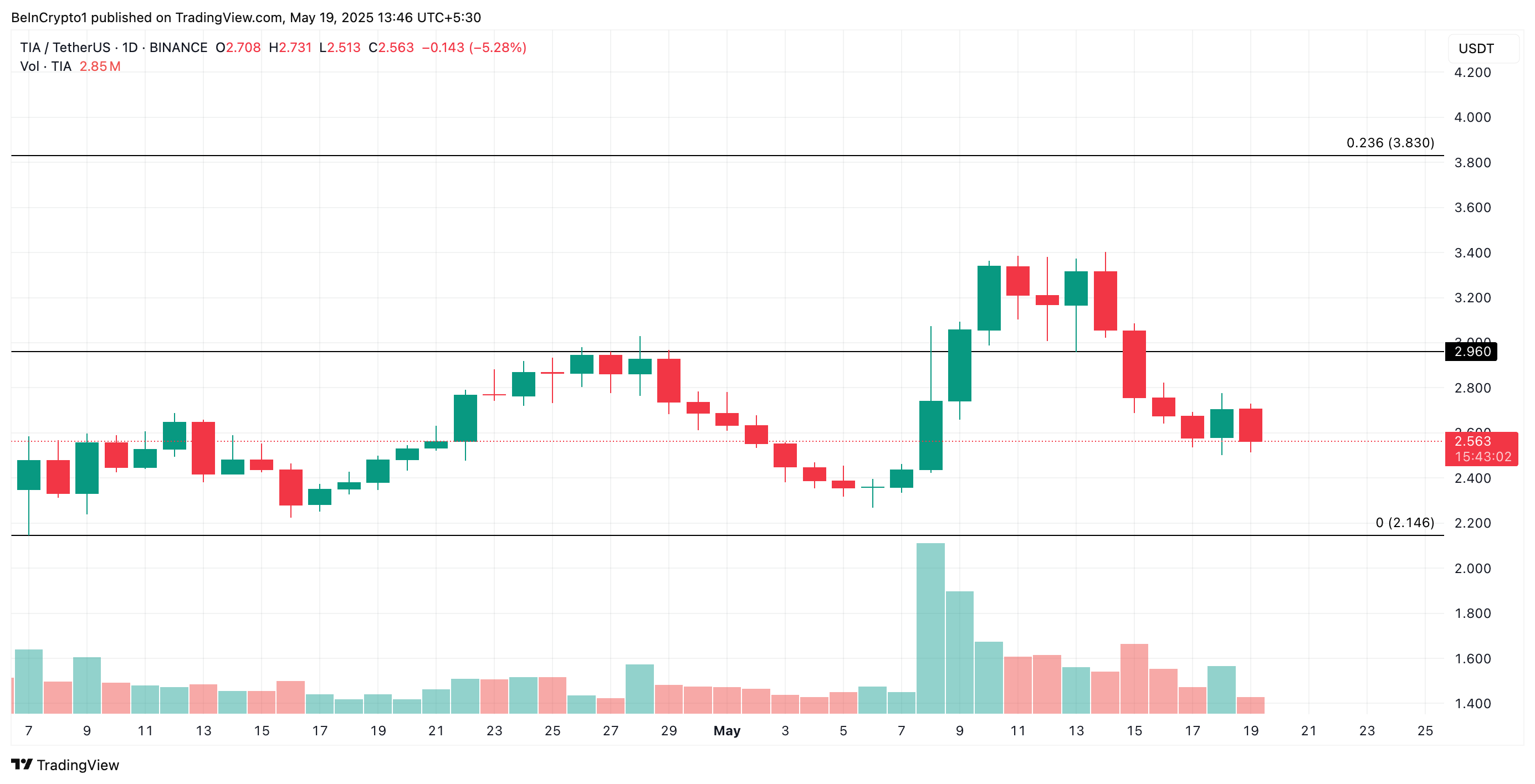 TIA telah anjlok 23% selama seminggu terakhir, menjadikannya salah satu penurun terjal di pasar. Altcoin ini saat ini diperdagangkan pada US$2,56, turun lagi 3% hari ini mengikuti tren penurunan pasar yang lebih luas.
