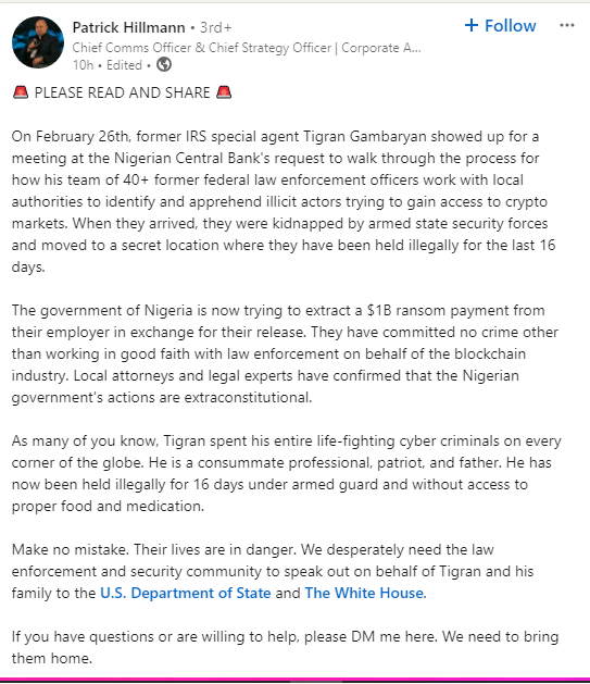 “Pemerintah Nigeria kini mencoba meminta uang tebusan US$1 miliar dari perusahaan tempatnya bekerja [Binance] sebagai imbalan atas pembebasan. Mereka tidak melakukan kejahatan apa pun dan pengacara lokal juga sudah mengonfirmasi bahwa tindakan pemerintah Nigeria bersifat ekstrakonstitusional,” tambah Hillman.