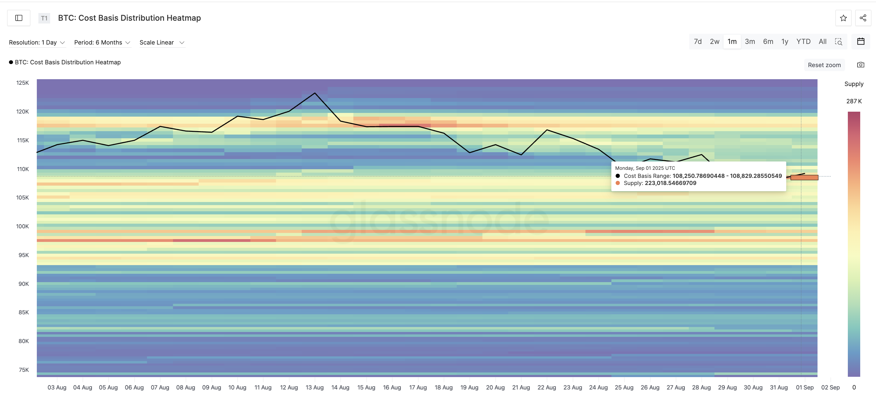 Di sisi penurunan, klaster lain antara US$108.250 dan US$108.829 menampung lebih dari 223.000 BTC, memberikan dukungan yang kuat.