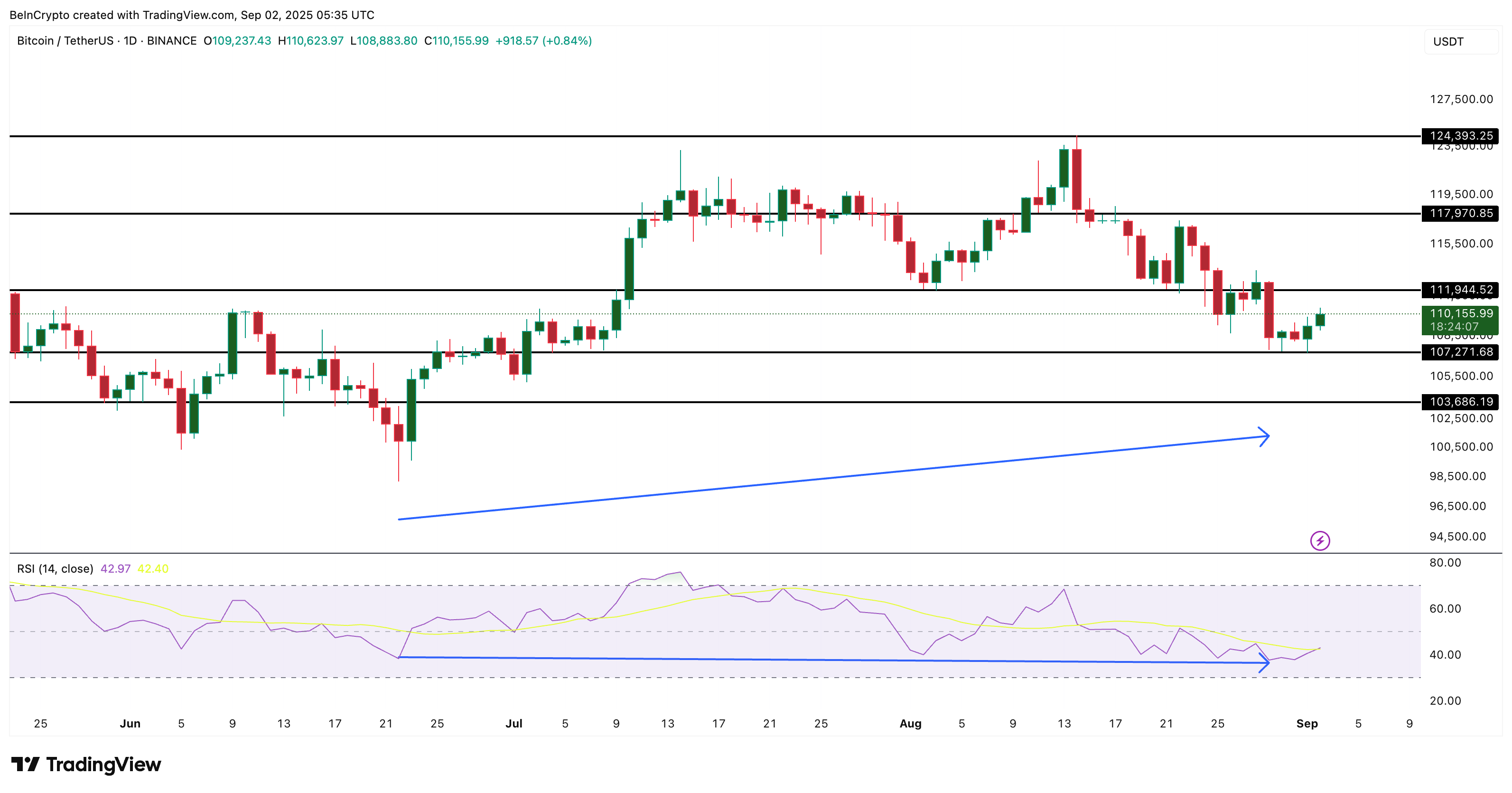 Sinyal bullish ketiga datang dari grafik harian. Antara 24 Agustus dan 2 September, BTC membuat posisi terendah yang lebih tinggi, sementara RSI (Relative Strength Index) — indikator momentum yang melacak kecepatan perubahan harga — mencetak posisi terendah yang lebih rendah. Pola ini dikenal sebagai divergensi bullish tersembunyi, sering kali mengisyaratkan kelanjutan.