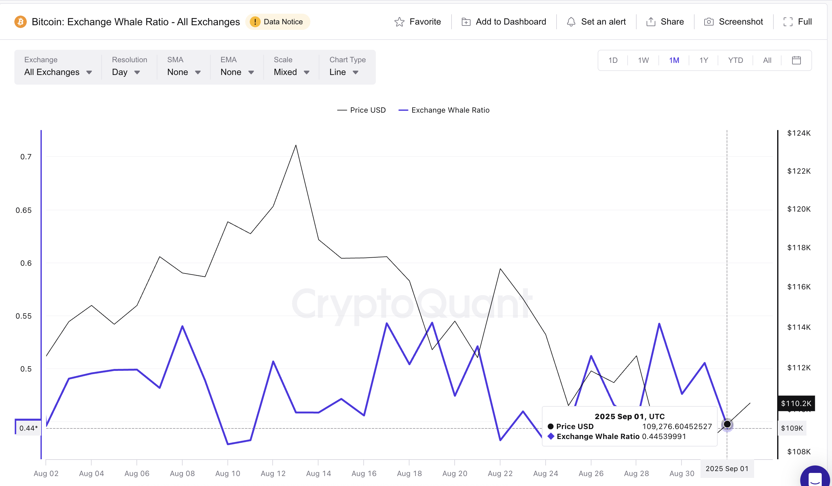Alasan kedua mengapa risiko koreksi nampaknya terbatas berasal dari whale. Rasio exchange-to-whale telah turun dari 0,54 menjadi 0,44 sejak 29 Agustus, salah satu level terendah secara bulanan.