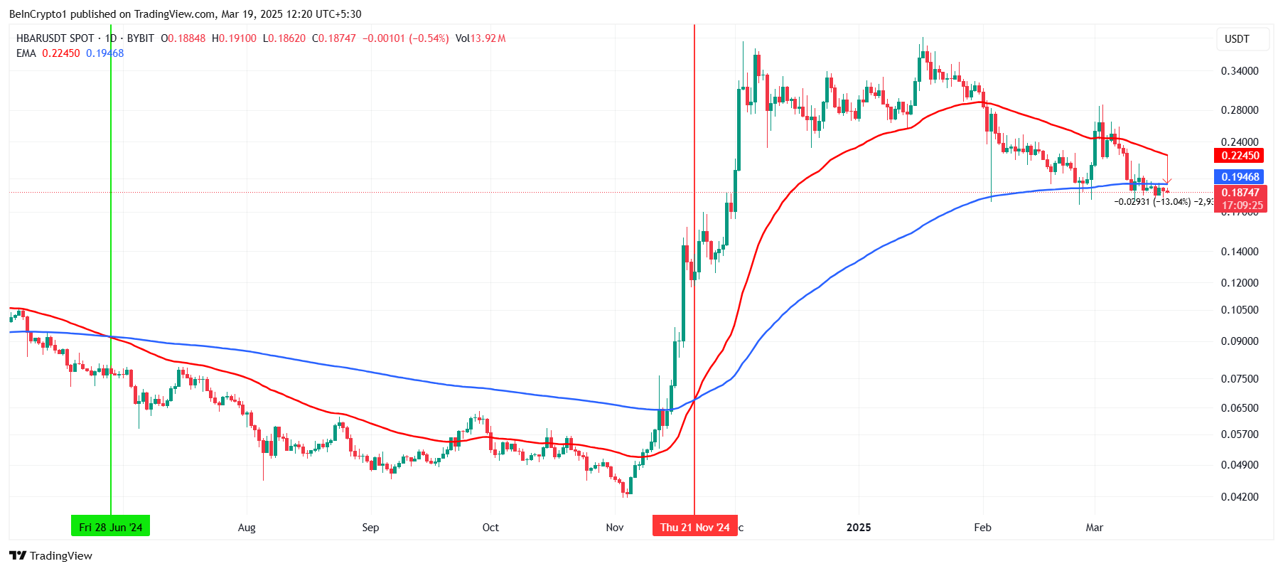 Exponential Moving Averages (EMAs) untuk HBAR mendekati pembentukan Death Cross, indikator bearish yang bisa mendorong harga lebih rendah. Death Cross terjadi ketika EMA 200-hari melintasi EMA 50-hari, menandakan bahwa momentum pasar yang lebih luas bergeser ke arah penurunan. Terakhir kali ini terjadi pada Juni 2024; HBAR memasuki tren penurunan berkepanjangan yang berlangsung selama lima bulan dan mengakibatkan penurunan harga yang signifikan.