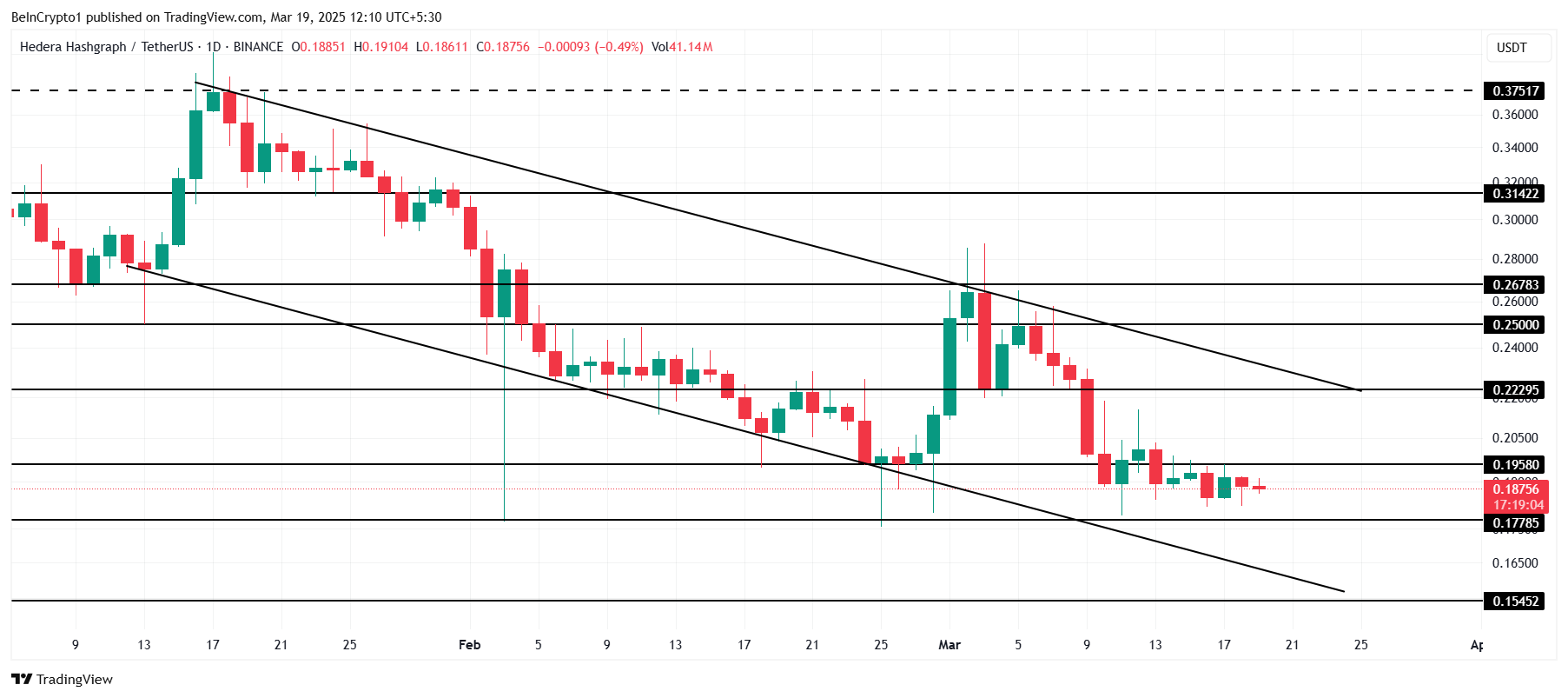 Harga HBAR saat ini diperdagangkan pada US$0,187, bergerak dalam saluran menurun. Altcoin ini mendekati level support kritis di US$0,177, dan kemungkinan HBAR bisa menguji support ini atau berpotensi menembusnya dalam waktu dekat. Kegagalan untuk bertahan di US$0,177 bisa menandakan risiko penurunan lebih lanjut untuk altcoin ini.