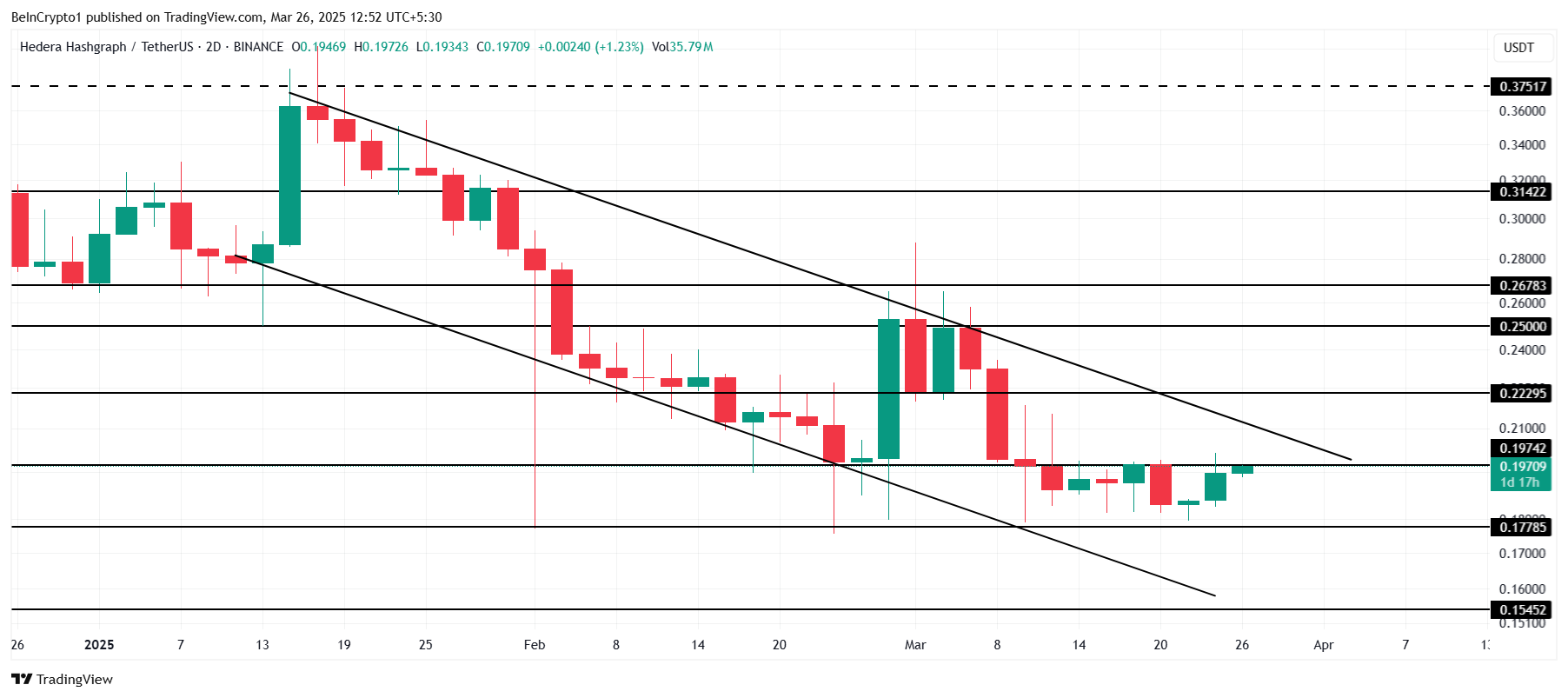 Saat ini diperdagangkan pada US$0,197, HBAR berusaha untuk mempertahankan level ini sebagai support. Namun, ia terjebak di bawah US$0,200 selama dua minggu terakhir, tidak mampu membuat keuntungan signifikan. Harga perlu secara konsisten bertahan di atas US$0,197 untuk jangka waktu yang lebih lama untuk menandakan potensi pemulihan.