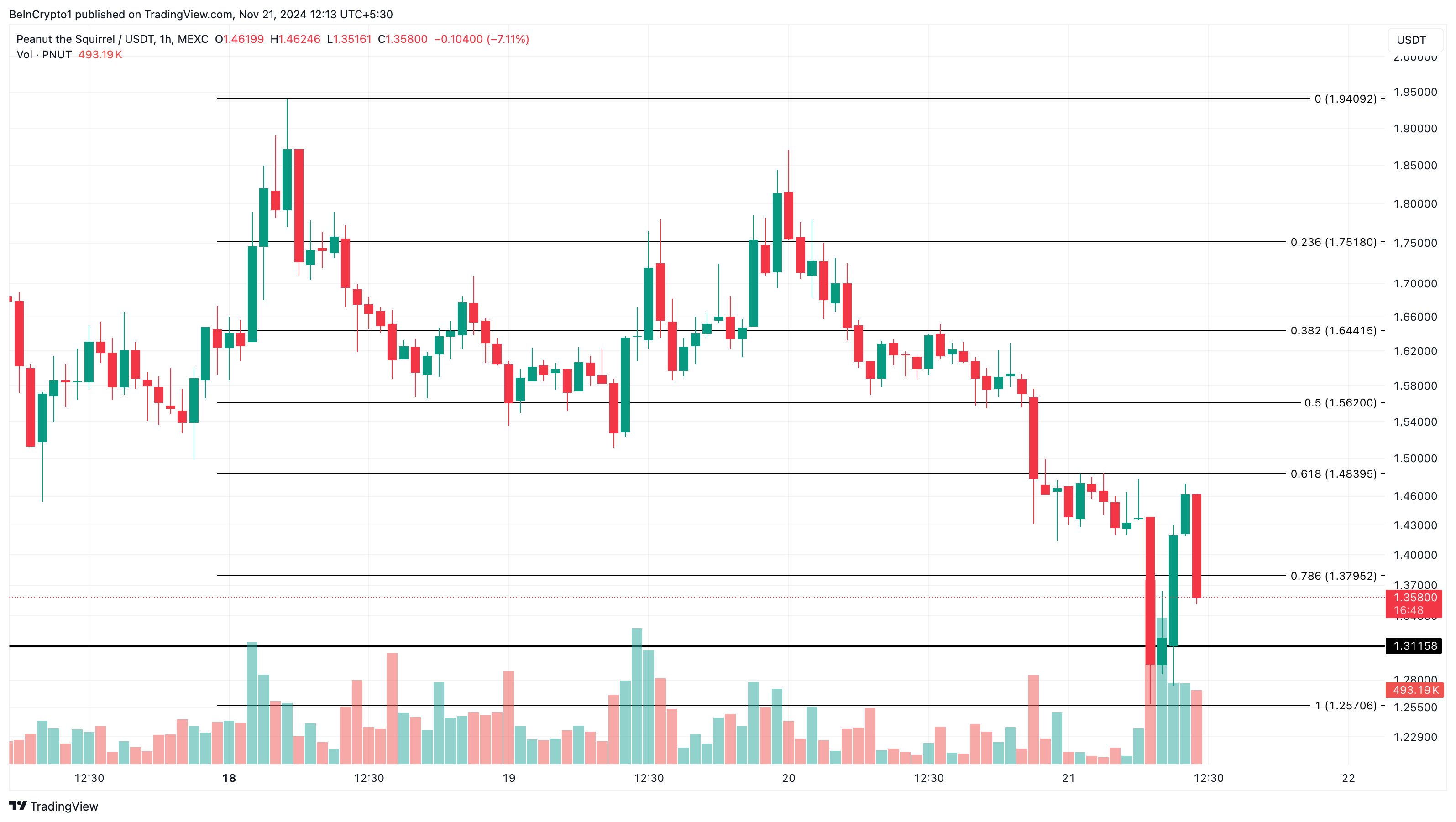 Peanut the Squirrel (PNUT), meme coin yang baru-baru ini berhasil menembus kapitalisasi pasar US$2 miliar, mengalami penurunan tajam hingga 30% dalam satu pekan terakhir. Kondisi itu membuat harga PNUT turun menjadi US$1,36. Namun, sinyal menunjukkan bahwa pemulihan PNUT mungkin sudah dekat.