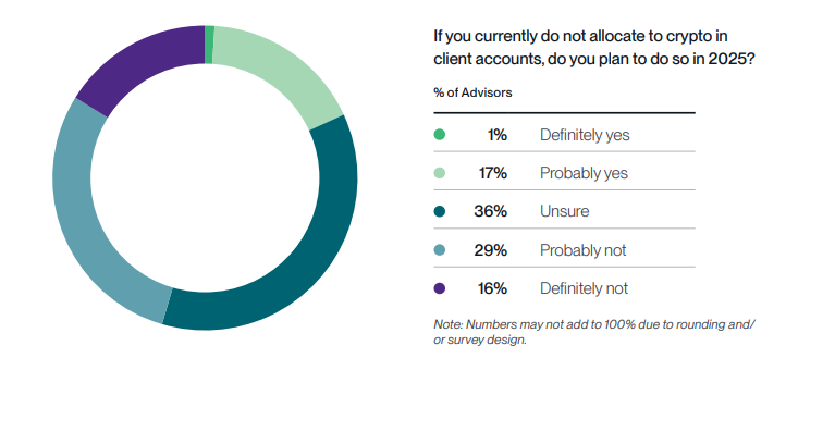 Selain itu, 19% penasihat yang sebelumnya menghindari eksposur aset kripto mengatakan mereka sekarang “pasti” atau “mungkin” berencana untuk berinvestasi dalam aset kripto untuk klien. Ini menandai peningkatan signifikan dari 8% pada 2024.