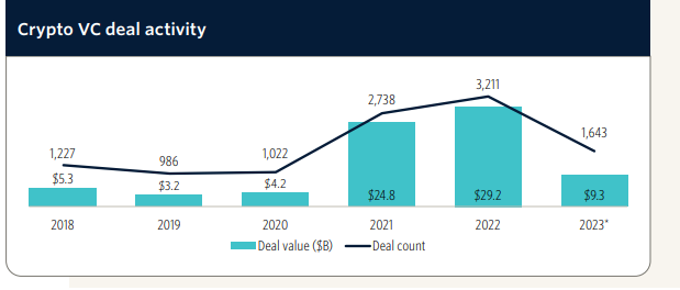 Secara total, nilai pendanaan yang didistribusikan ke sektor kripto dan blockchain mencapai kurang dari US$7 miliar dengan 1.564 kesepakatan. Padahal, pada tahun 2022, jumlah pendanaan yang masuk ke sektor anyar tersebut berhasil mencapai US$26,6 miliar dengan 2.891 kesepakatan.