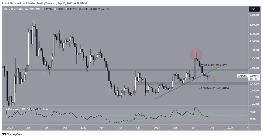 Bila kita mengamati analisis teknikal XRP pada time frame mingguan, terdapat prospek yang pesimistis. Baik pembacaan Relative Strength Index (RSI) maupun aksi harga, keduanya berkontribusi pada proyeksi bearish ini.