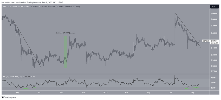 Sementara itu, dua analis lainnya menggunakan pola breakout dan bullish divergence untuk memprediksi bahwa harga XRP akan segera melampaui angka US$1. Pengamatan ini sangat menarik lantaran pola bullish divergence sebelumnya (garis hijau) telah menyebabkan kenaikan 95% pada September 2022. Kenaikan serupa akan mengantarkan harga XRP mendekati level US$1.