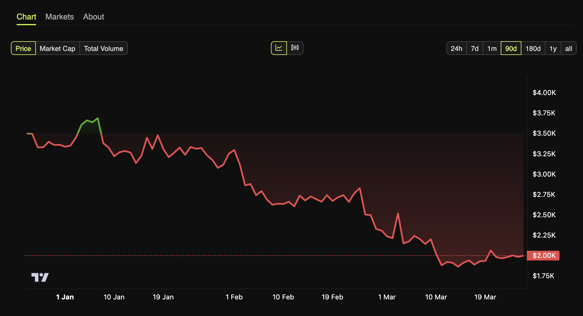 Dalam satu bulan terakhir, Ethereum telah terkoreksi 25,1%. Pada waktu publikasi, harga altcoin ini bertengger di angka US$1.997, yang artinya hanya naik tipis 0,45% dalam 24 jam terakhir.
