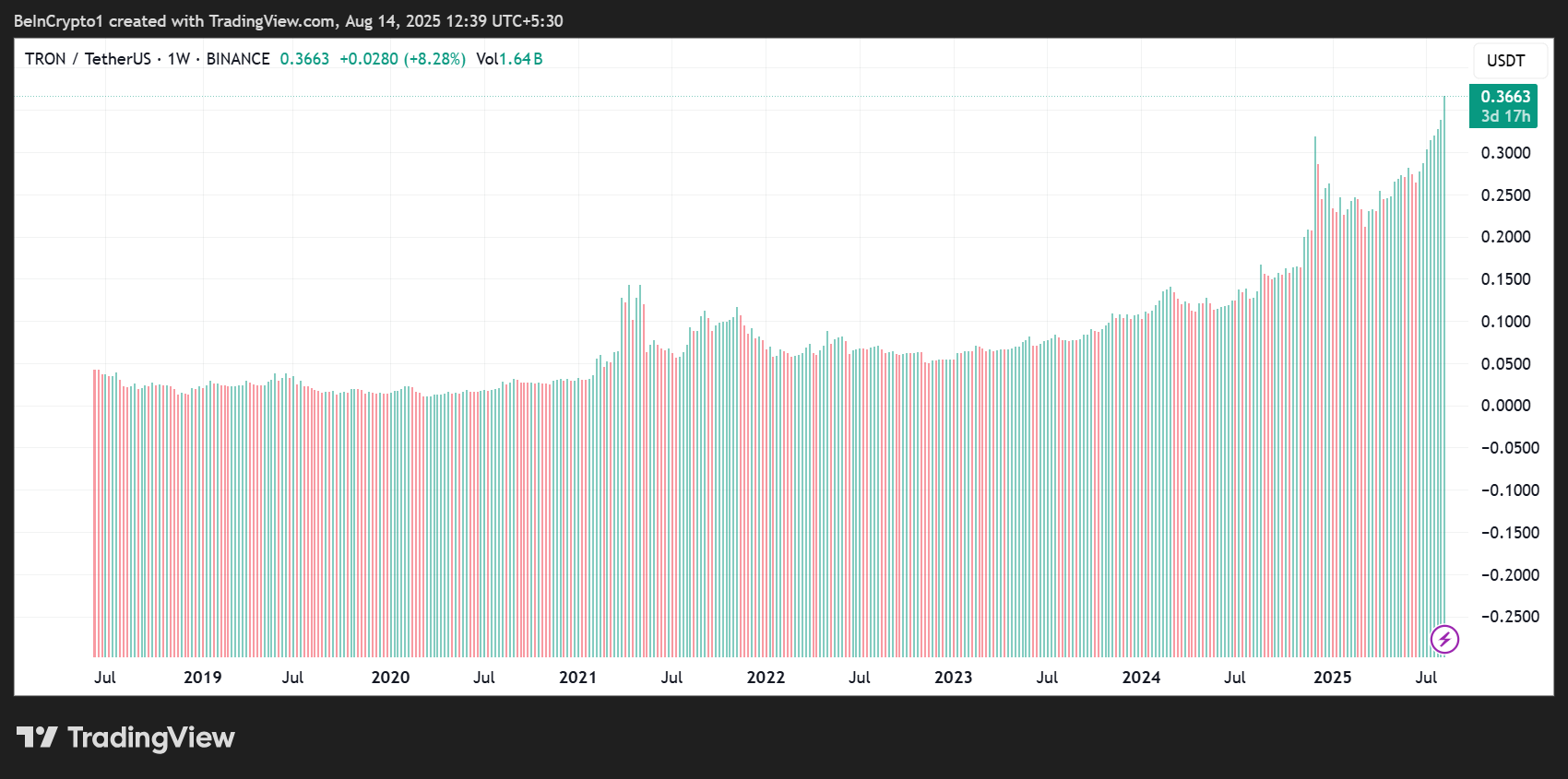 Spekulasi ini mungkin tidak terlalu jauh mengingat bagaimana TRX Tron telah mempertahankan aksi harga yang cukup stabil selama bertahun-tahun. Sementara itu, kripto lainnya telah menunjukkan volatilitas yang signifikan selama bertahun-tahun.