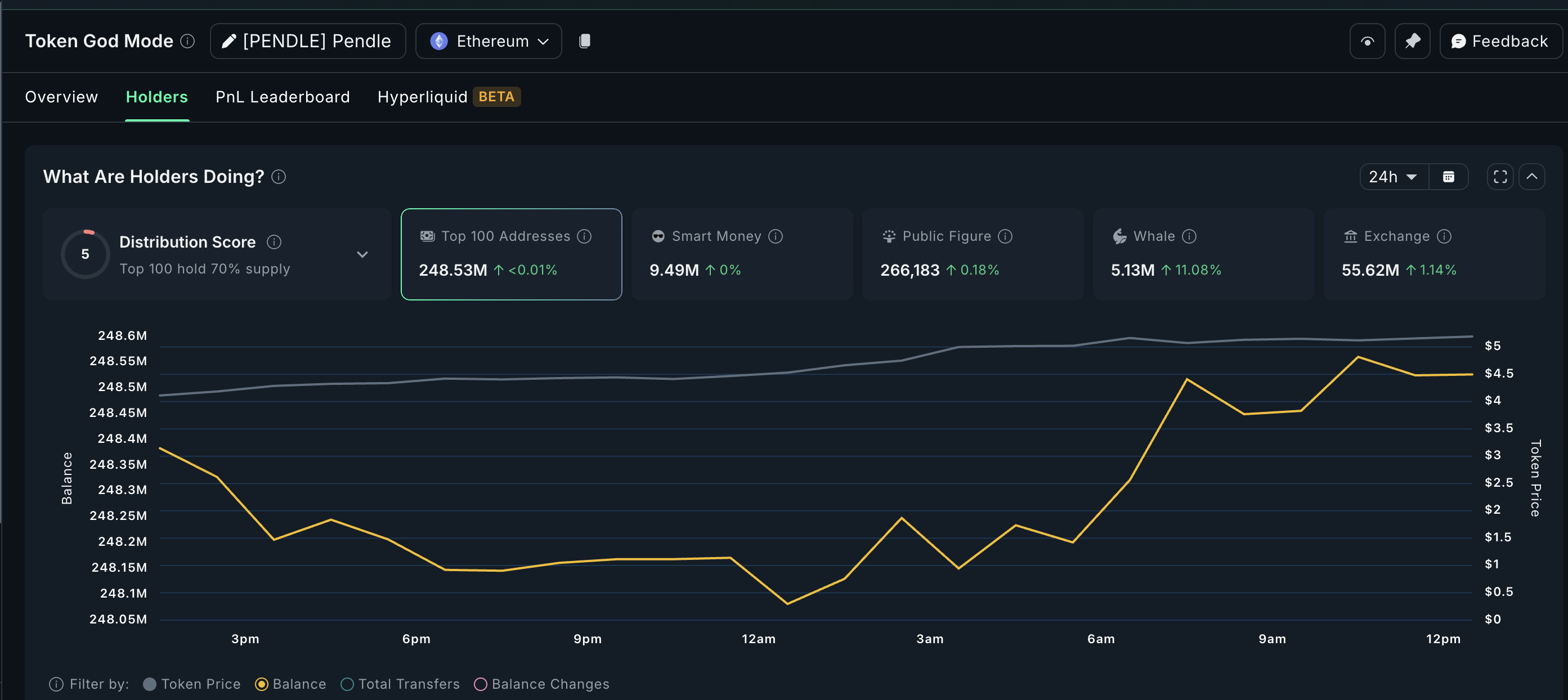 Aktivitas whale meledak segera setelah kolaborasi ENA diumumkan. Dalam 24 jam terakhir, whale meningkatkan kepemilikan PENDLE mereka sebesar 11,08%, mendorong simpanan mereka menjadi 5,13 juta token. Ini berarti mereka telah membeli sekitar 513.000 token baru, senilai lebih dari US$2,60 juta pada harga saat ini.