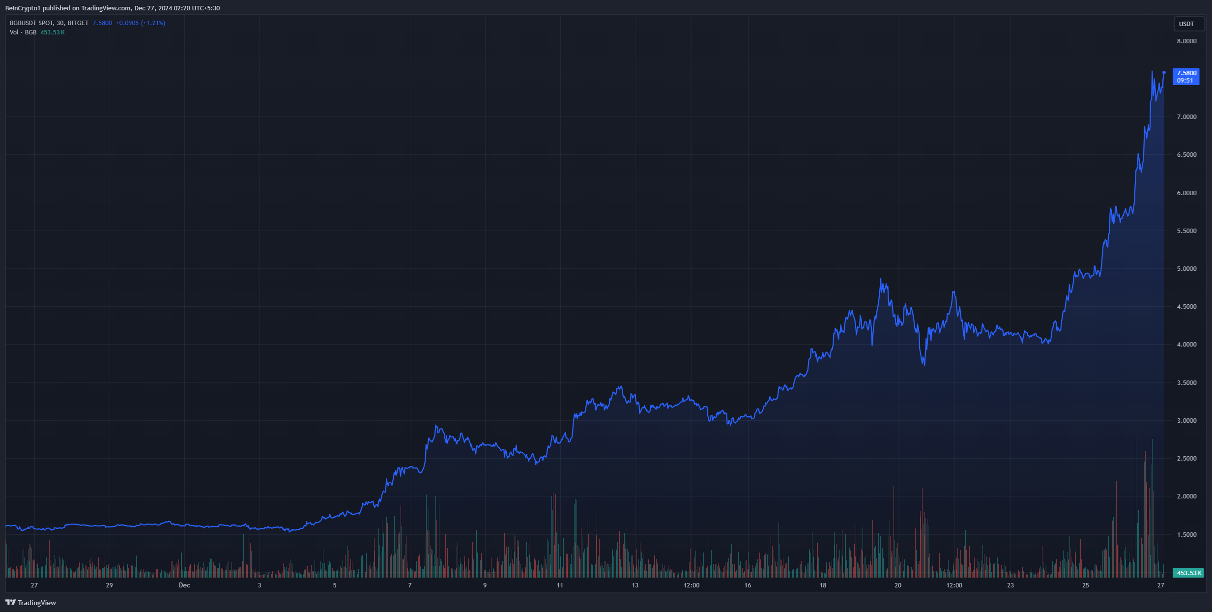 SponsoredBerita ini mendorong Bitget Token (BGB) mencapai harga tertinggi sepanjang masa sebesar US$7,79. Kapitalisasi pasar token ini sekarang melebihi US$10,3 miliar. BGB reli 30% hari ini dan naik lebih dari 350% di bulan Desember saja.