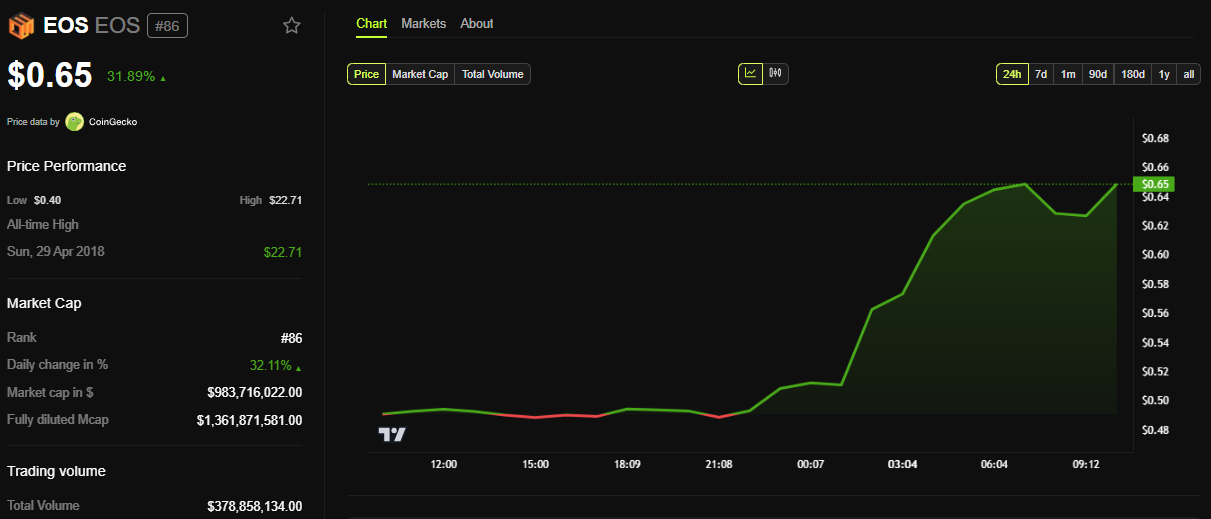 Sementara itu, data BeInCrypto menunjukkan bahwa harga EOS berada pada US$0,65 pada waktu publikasi. Ini mewakili lonjakan hampir 32% dalam 24 jam terakhir.