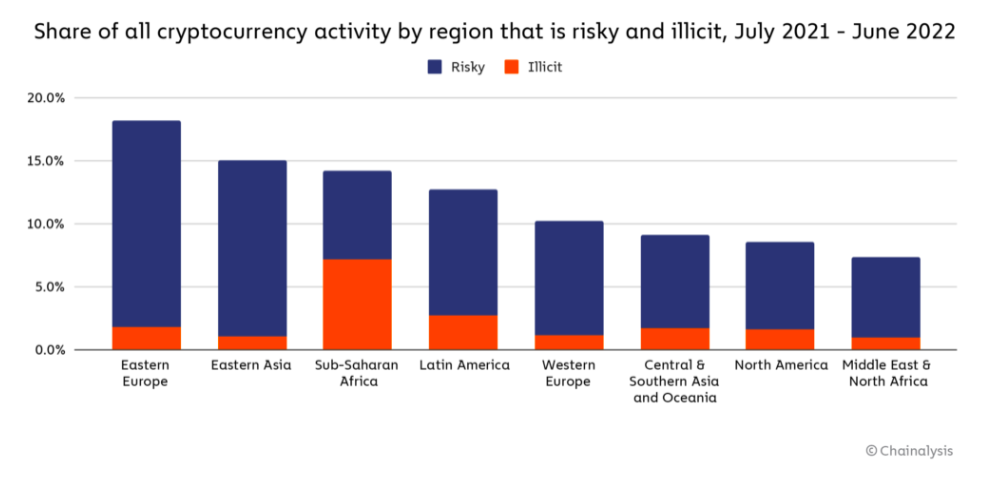 Setidaknya, terdapat 18,2% aktivitas kripto di wilayah Eropa yang ‘berisiko’ atau ‘terlarang’. Pada posisi tertinggi berikutnya, disusul Asia yang mencapai 15%. Selanjutnya, urutan ketiga, diisi oleh Afrika Sub Sahara, yang sejauh ini dinilai memiliki bagian terbesar dari aktivitas terlarang yang melibatkan kripto. Perkembangan terbaru dari aktivitas berisiko dan kegiatan terlarang yang berhubungan dengan kripto mungkin saja dapat semakin meningkatkan persentase ini.