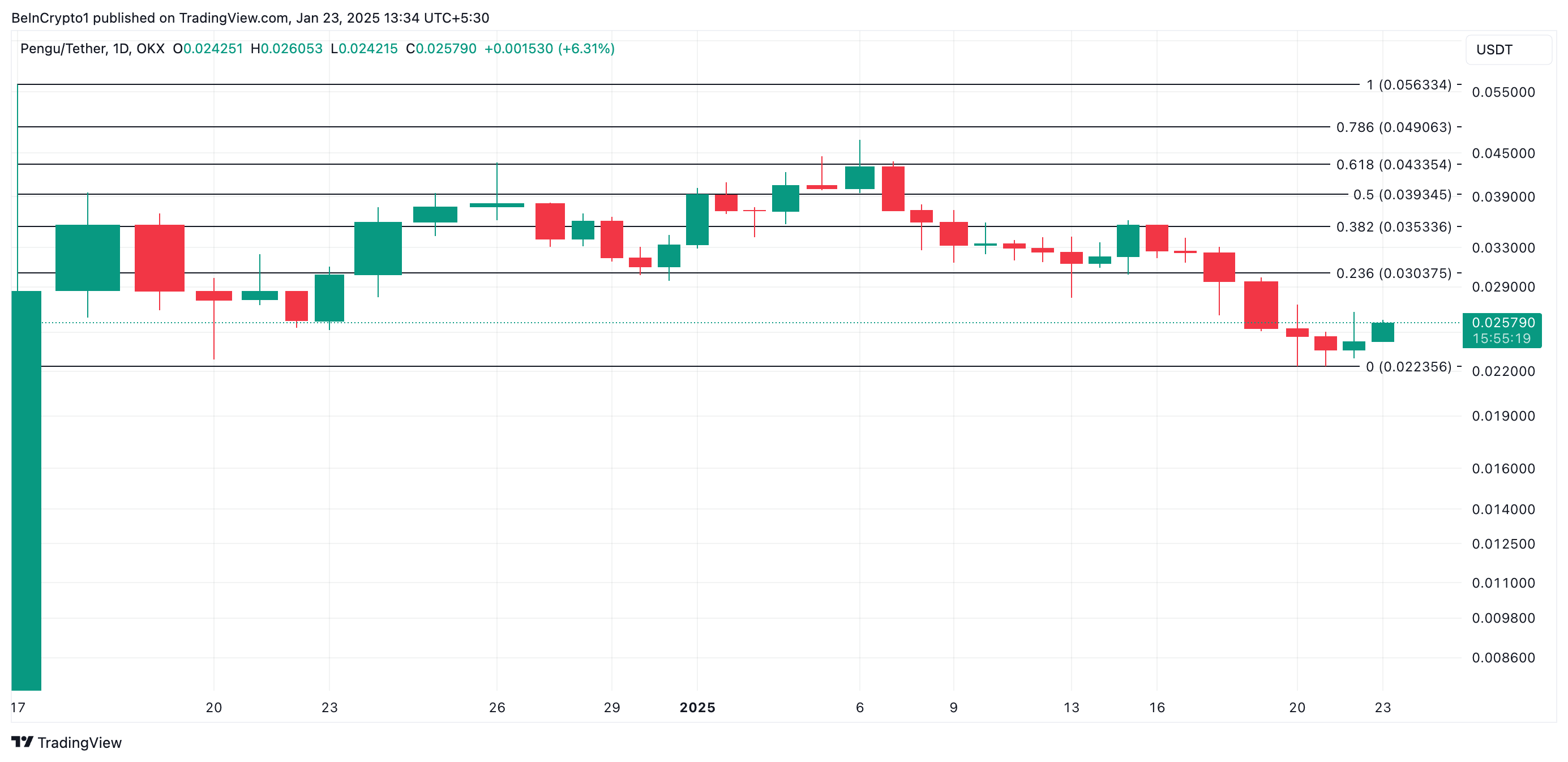 PENGU bergerak pada kisaran US$0,025 pada saat penulisan, sedikit di atas support yang terbentuk di level terendah sepanjang masa di US$0,022. Jika aktivitas pembelian berkurang, harga token bisa turun menuju level ini dalam waktu dekat.