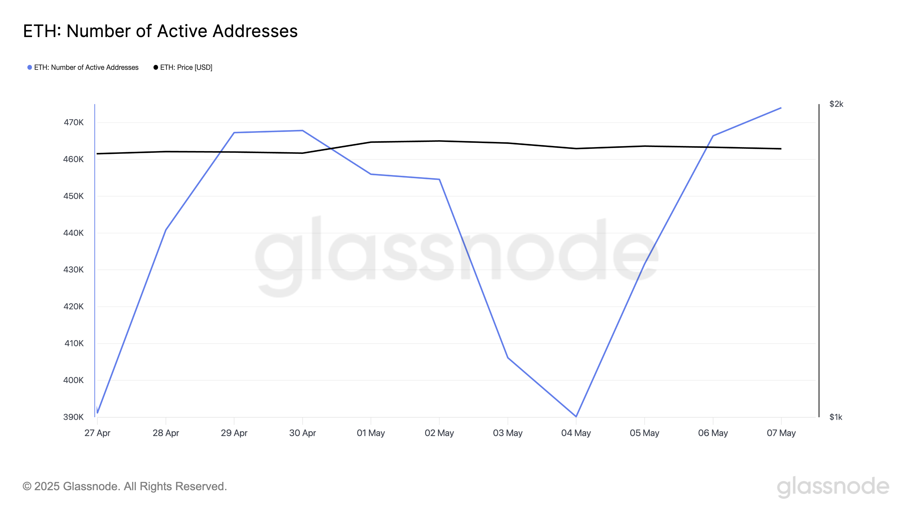Data Glassnode menunjukkan jumlah alamat aktif Ethereum telah naik ke level tertinggi dalam 30 hari, menandakan keterlibatan pengguna yang diperbarui. Menurut penyedia data, pada 7 Mei, jumlah alamat unik yang aktif di jaringan, baik sebagai pengirim atau penerima, mencapai 474.044.