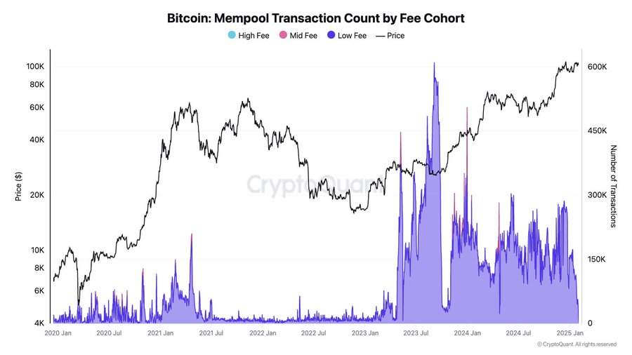 Di luar gejolak pasar, aktivitas jaringan Bitcoin telah menurun secara signifikan, dengan mempool—area tunggu untuk transaksi yang belum dikonfirmasi—menunjukkan penurunan volume yang mencolok.