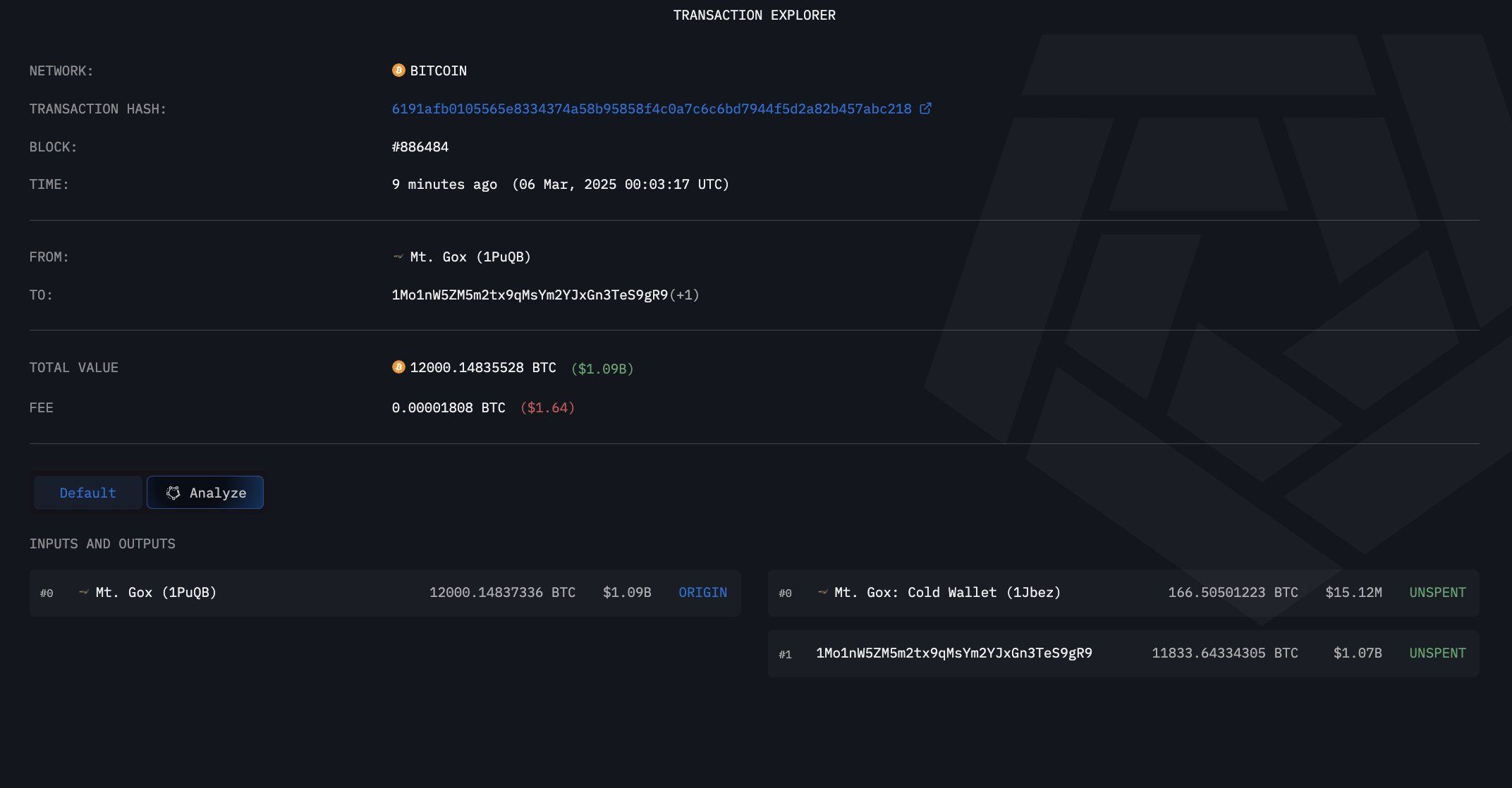 Mt. Gox mengirim 11.833,6 BTC, senilai sekitar US$1 miliar, dari wallet-nya (1PuQB) ke alamat baru (1Mo1n). Selain itu, mereka mentransfer 166,5 BTC, senilai US$15,1 juta, ke cold wallet-nya (1Jbez). Tidak ada pergerakan lebih lanjut setelah transaksi ini.