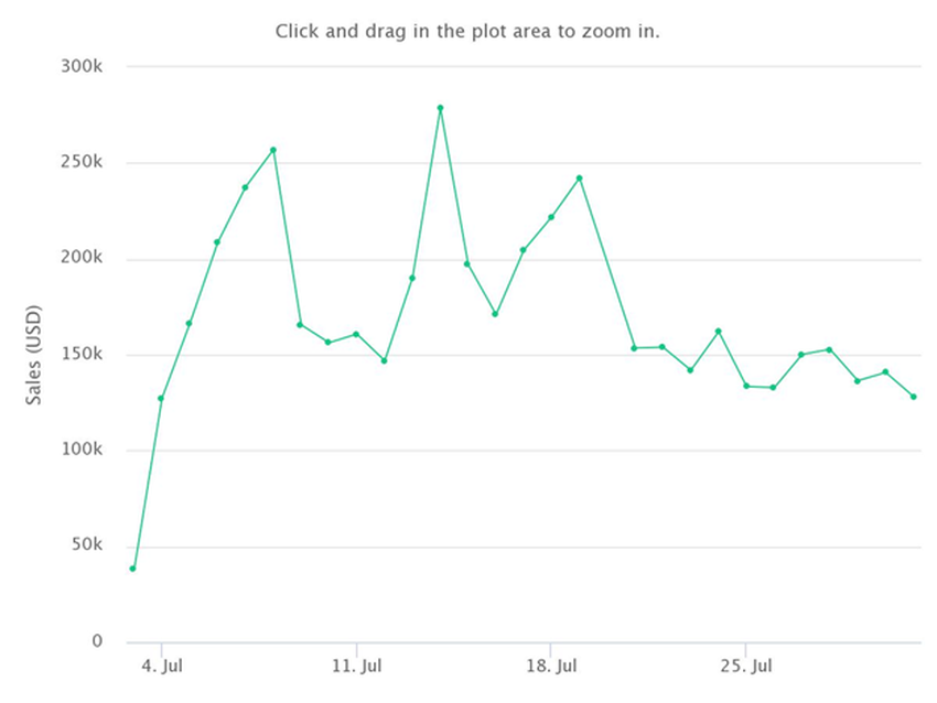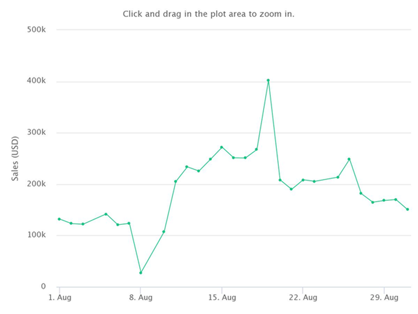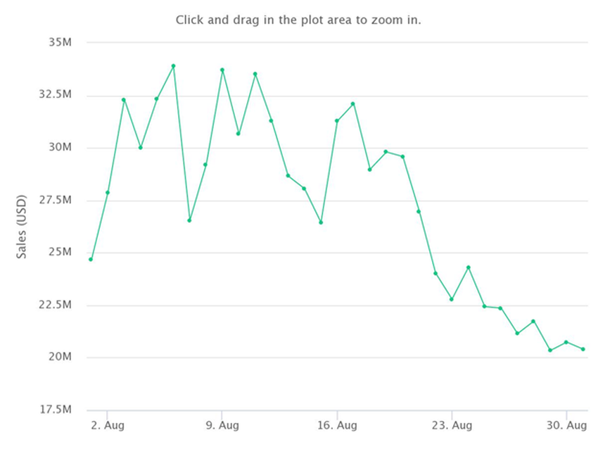 Sehubungan dengan tingkat penjualan ini, pada bulan Agustus sendiri harga Axie menukik tajam sampai 99% selama periode year-over-year. Dalam periode tersebut, tercatat sebanyak 305.264 unique buyer dengan total 1,85 juta transaksi.