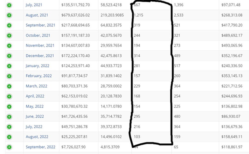 Pada bulan Agustus 2022, jumlah total unique buyer CryptoPunks anjlok menjadi hanya 103. Itu artinya, mencerminkan penurunan sebesar 92% dari puncaknya pada Agustus tahun lalu sebanyak 1.215. Sementara itu, terakhir kalinya jumlah unique buyer berjumlah kurang dari angka ini yaitu terjadi pada Desember 2020, dengan jumlah 96.