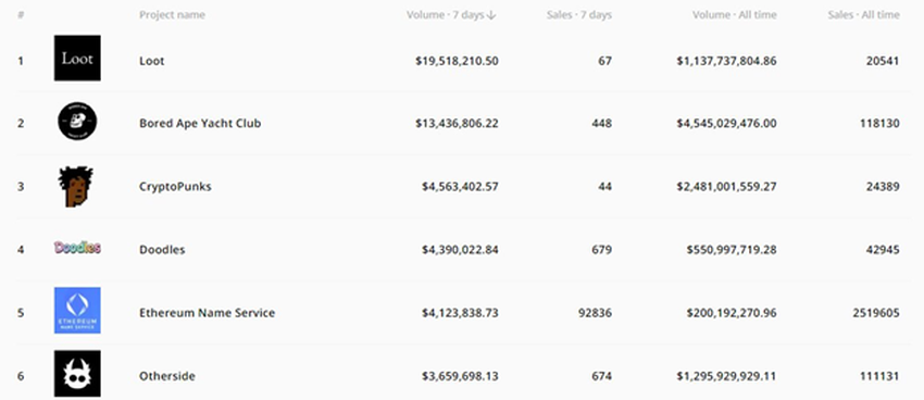Tidak berhenti sampai di situ, koleksi digital ini ternyata juga masih menjadi koleksi terlaris berdasarkan penjualan mingguannya. Di samping itu, CryptoPunks hanya tertinggal 2 peringkat dari proyek Loot and Bored Ape Yacht Club. Di mana keduanya masing-masing masih memimpin di peringkat pertama dan kedua. Lalu di bawah CryptoPunks, terdapat Doodles, Ethereum Name Service, dan Otherside yang melengkapi daftar peringkat 6 proyek NFT terlaris tersebut.