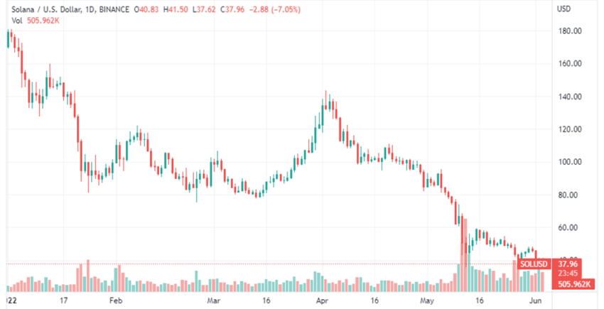 SOL mengawali hari pertama di tahun 2022 dengan harga US$170,31. Lalu, mencapai rekor tertingginya tahun ini pada tanggal 2 Januari dan menguji titik local low baru di level US$38,36 saat 2 Juni kemarin. Pada saat penulisan, SOL sedang diperdagangkan di kisaran US$40.