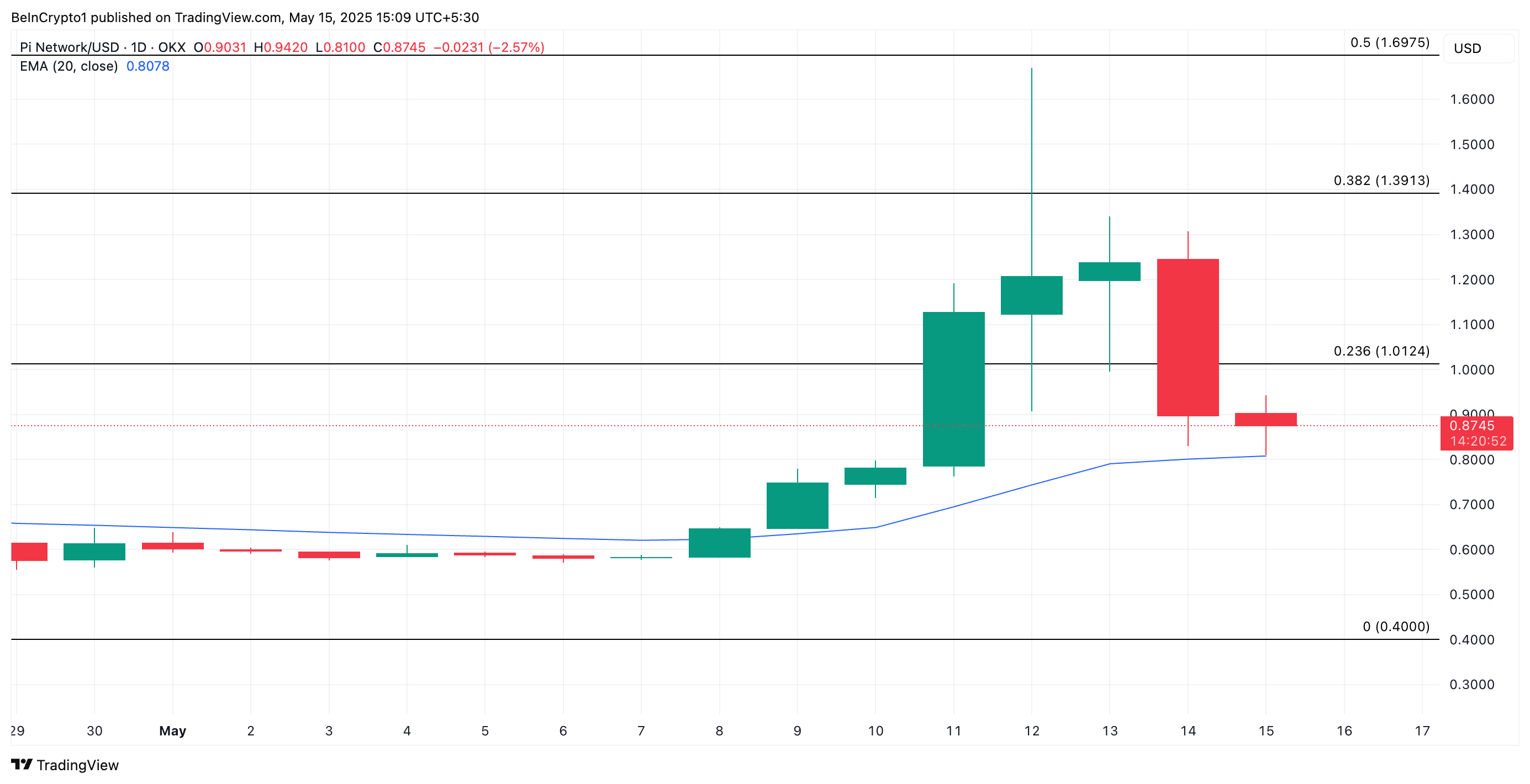 Bacaan grafik satu hari PI/USD menunjukkan bahwa penurunan ini mungkin belum berakhir. Pada waktu publikasi, harga PI hampir turun di bawah Exponential Moving Average (EMA) 20 hari, yang menunjukkan tren bearish yang berkelanjutan.