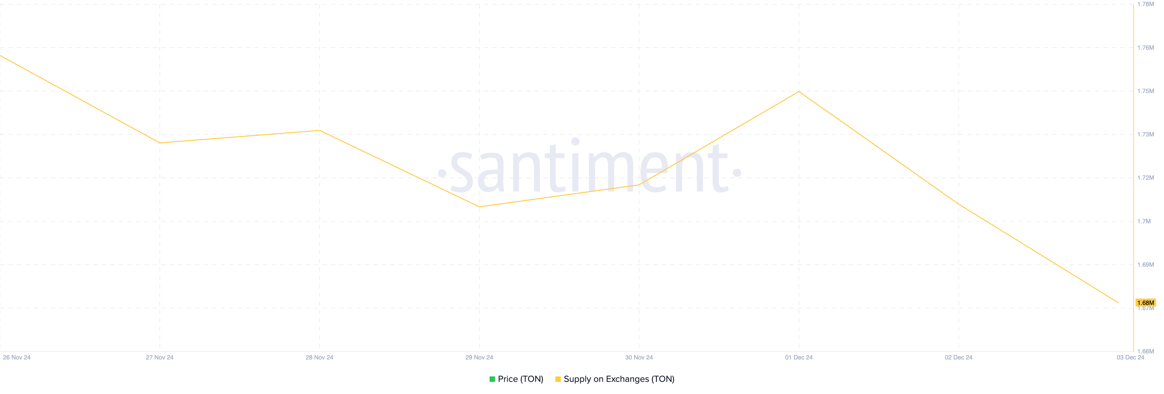 Supply TON di Exchange telah menurun menjadi 1,68 juta, turun dari 1,75 juta pada 1 Desember. Penurunan ini menunjukkan bahwa holder telah menarik sekitar 800.000 TON dari exchange selama tiga hari terakhir.