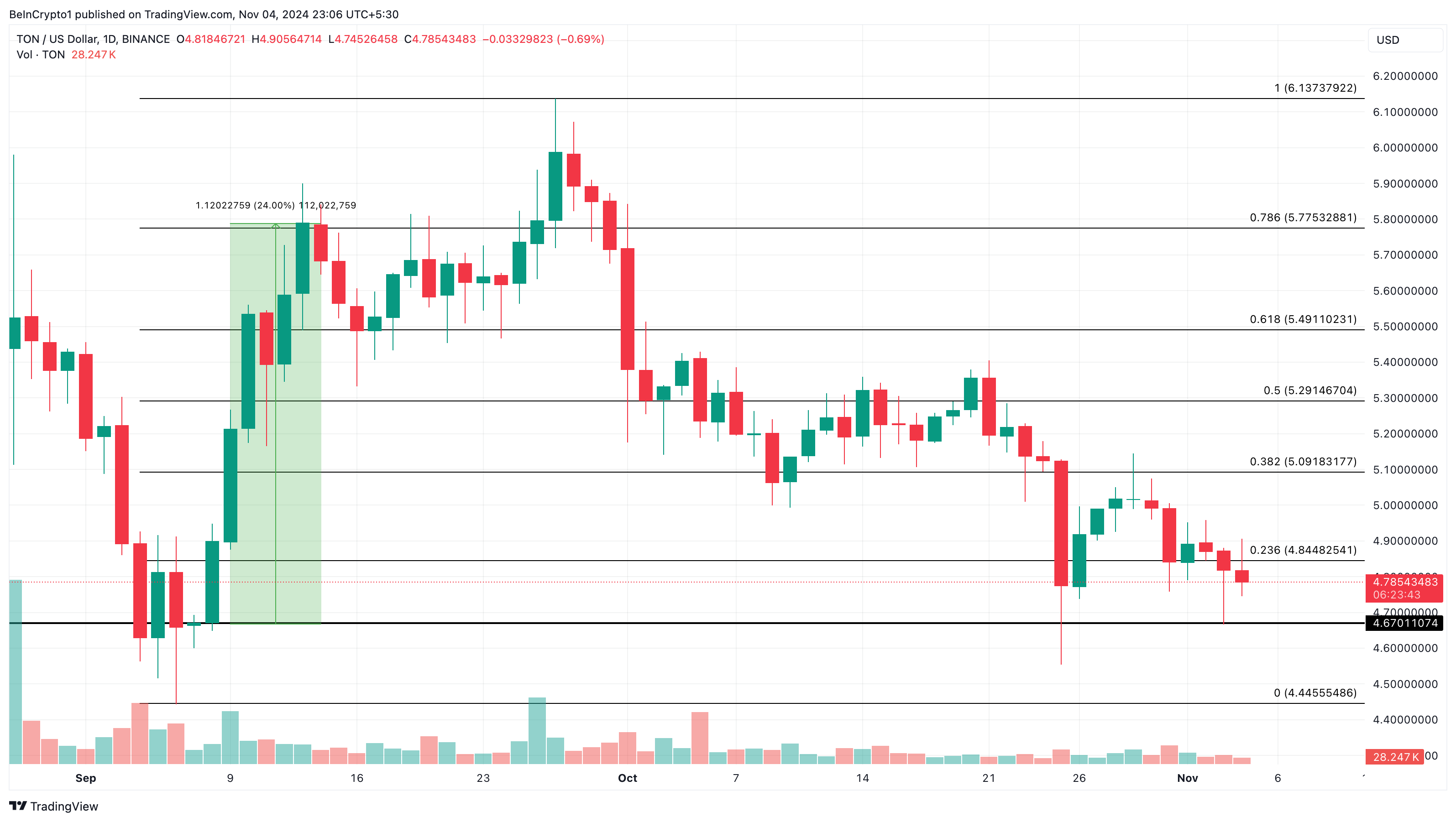 Tinjauan lain pada grafik harian TON/USD menunjukkan bahwa bulls telah membentuk support kuat di US$4,67. Support ini sangat penting bagi reli 24% altcoin pada September, yang mengurangi kerugian Toncoin dan membantunya mencapai US$5,80.