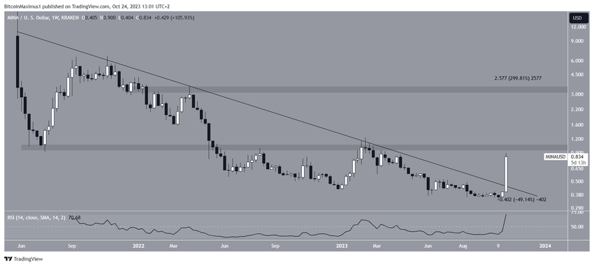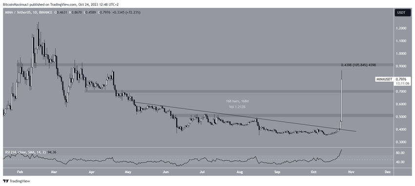 Harga MINA telah melonjak 100% selama 24 jam terakhir, yang berpuncak pada level tertinggi tahunan baru di angka US$0,86.