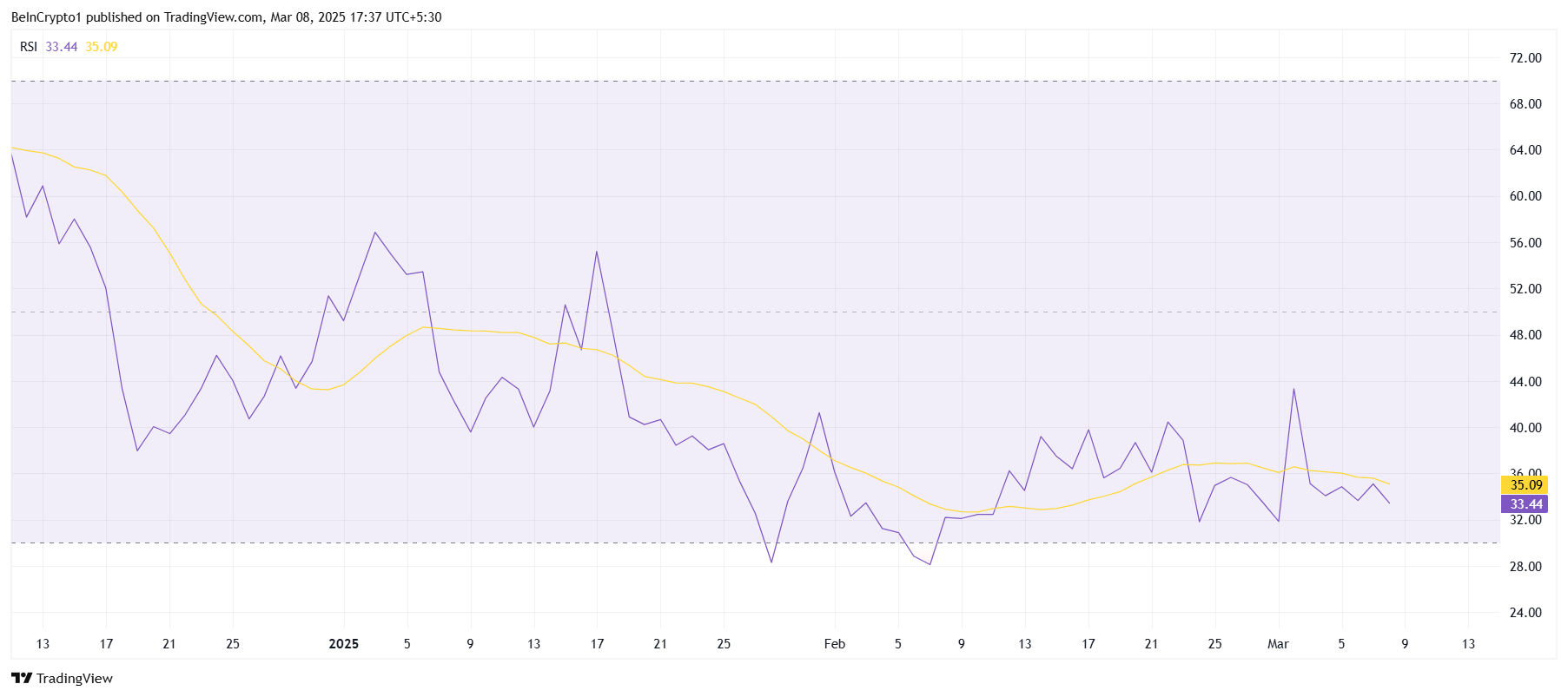 Momentum makro PEPE tetap lemah, dengan indikator teknis menunjukkan kondisi bearish yang terus berlanjut. Relative Strength Index (RSI) tetap terjebak di zona bearish selama lebih dari sebulan, menunjukkan tekanan jual yang terus berlanjut.