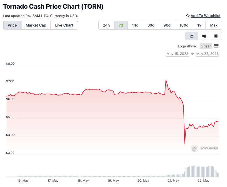 Terkait insiden peretasan ini, begini pergerakan harga native token Tornado Cash, yaitu TORN.