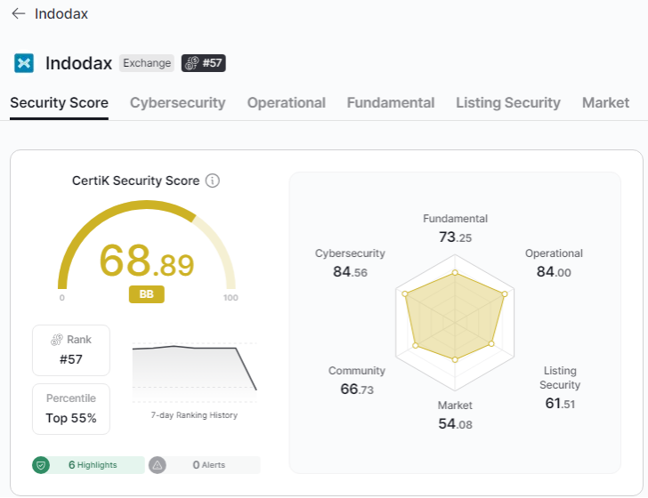 Tetapi yang jelas karena hal itu juga, skor keamanan Indodax di CertiK turun menjadi BB dengan nilai 68,89 dari sebelumnya berada di peringkat A dengan nilai 79,79. Peringkat Indodax juga turun ke level 57 dari sebelumnya 13.