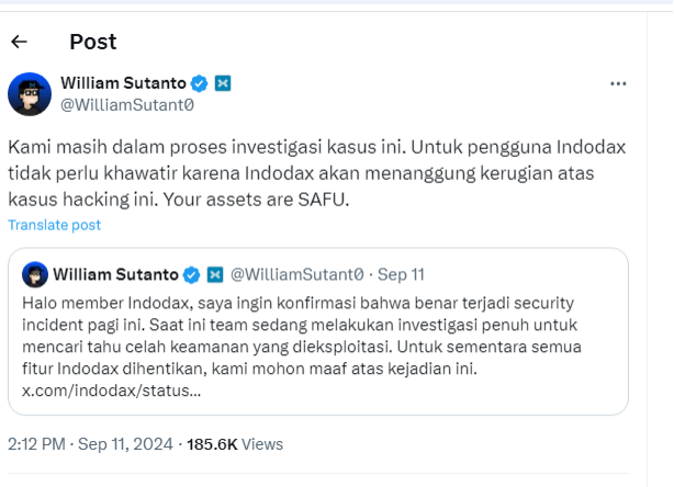 Sudah lebih dari 24 jam platform kripto Indonesia, Indodax menangguhkan operasionalnya akibat dugaan insiden peretasan. Salah satu pendiri yang juga merupakan Chief Technology Officer (CTO) Indodax, William Sutanto mengaku bahwa pihaknya masih melakukan investigasi.