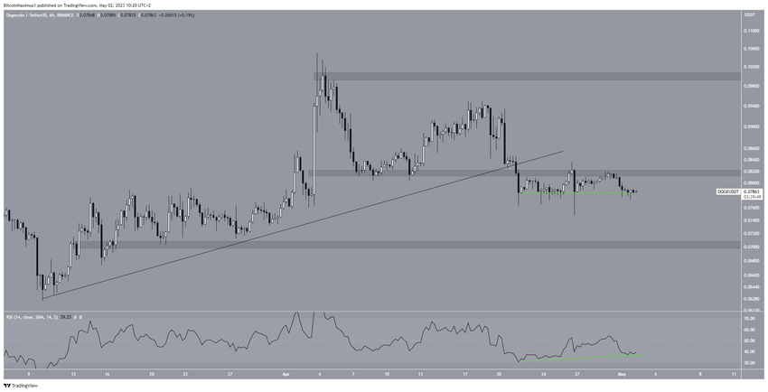 Pada grafik harga DOGE, hasil analisis teknikal dari time frame jangka pendek enam jamnya menunjukkan sinyal yang tak jelas. Dari pembacaan bearish-nya, harga DOGE mengalami breakdown dari garis ascending support pada tanggal 21 April.