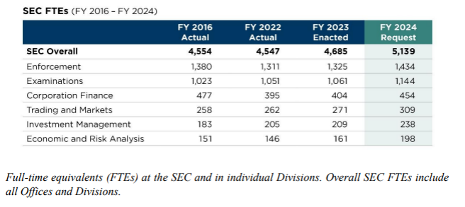 Salah satu pos keuangan yang mengalami kenaikan adalah pos penegakan. Gary Gensler mengajukan tambahan full time equivalents (FTEs) sebanyak 109 atau meningkat 8,22% menjadi 1.434 dari FTE di tahun lalu yang ditetapkan sebesar 1.325.