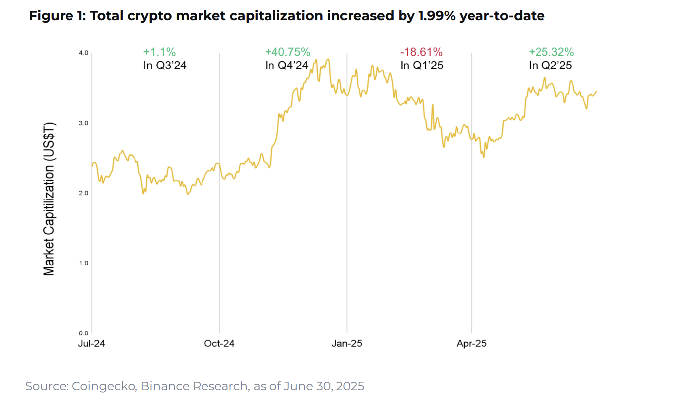Namun, pertumbuhan 1,99% yang sederhana di H1 2025 juga mencerminkan kenyataan yang jelas: pasar kripto tidak lagi didorong oleh FOMO seperti yang terlihat pada siklus bull sebelumnya.